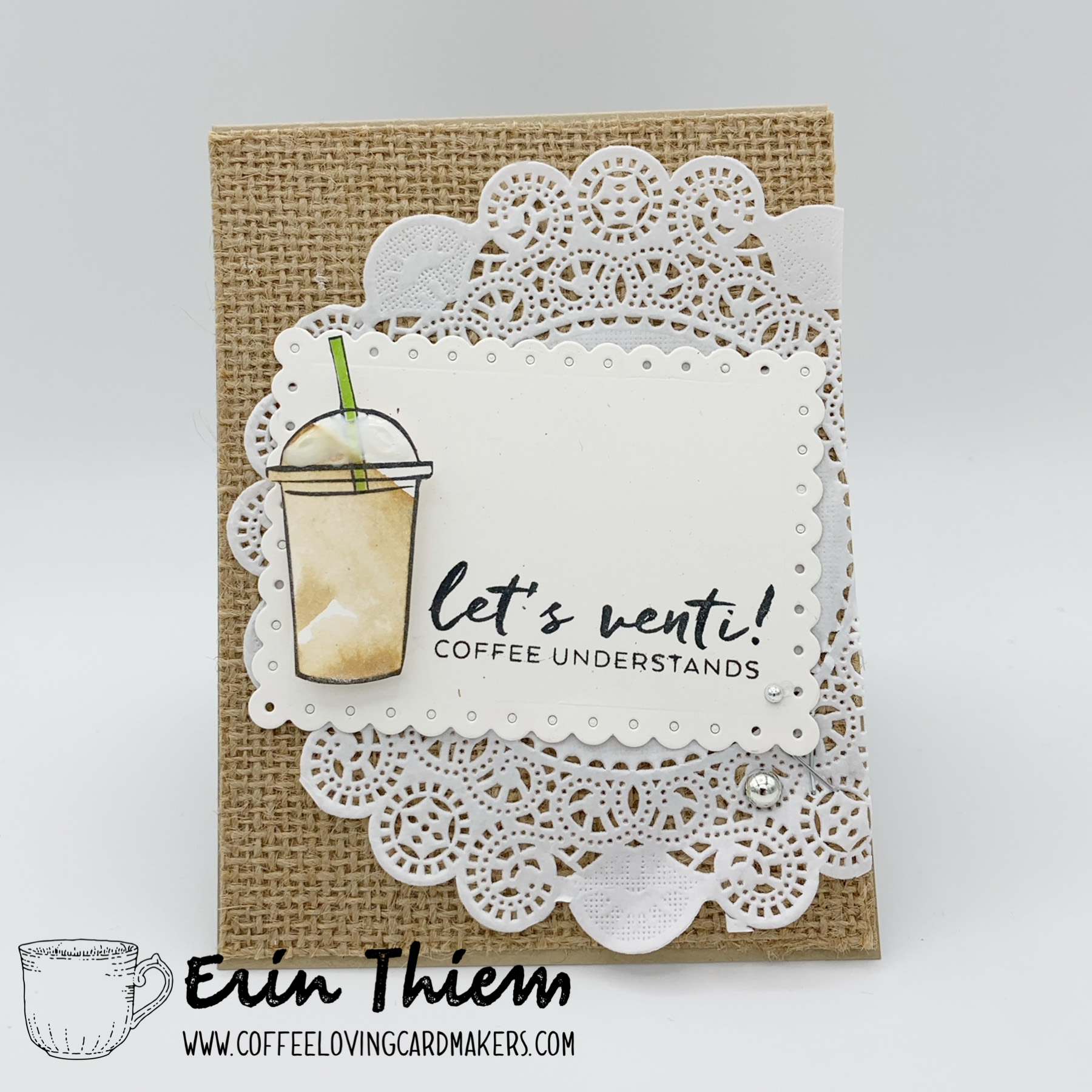 Hello, Erin here, I’m swapping days with Lori to bring you a card for those who are in need of a pick me up.  I’ve paired the Ellen Hutson coffee and sentiment with burlap, doily and a die cut and a few little silver bells from Fun Stampers Journey.  I was having a hard time getting the doily to lay flat, so I just used the trusty stapler.  Hope your Monday starts off on the right foot, we’re all going to need a little extra coffee this holiday season.