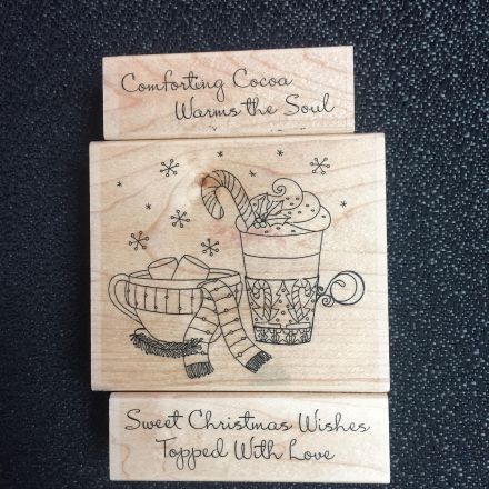 I bought this wood block stamp years ago at the stamp show! Back then I didn’t know what a coffee/tea/cocoa stamp obsession was but I do now! The sentiment is also from IO and is steadily one of my favorites at this time of year.