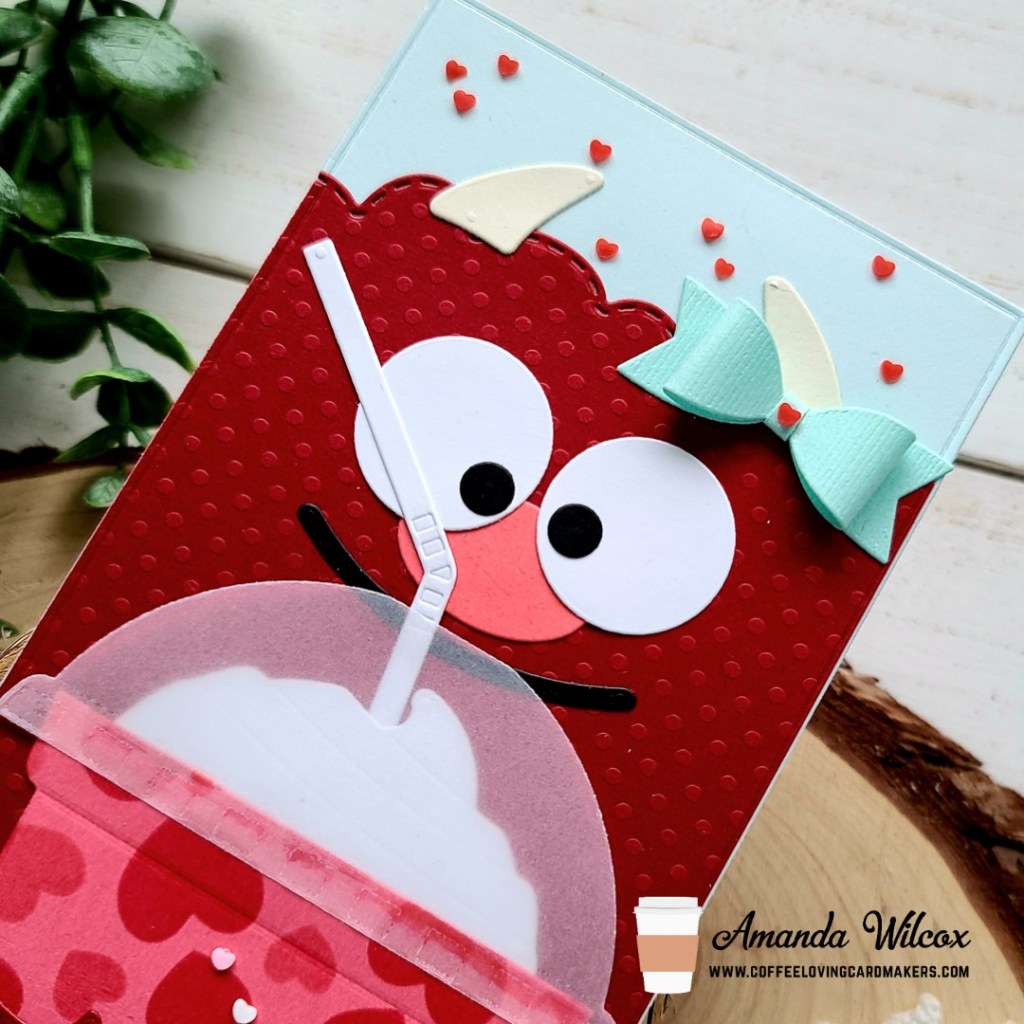 I started this card by die cutting the pieces to my monster using the Make-a-Monster dies. Then I cut the pieces to that yummy frap with the Summertime Sips dies. I took the Heartburst stencil and inked red and dark pink hearts on the cup for a little interest. I die cut the largest Slimline Modern Embossed Panel from light blue and the same red as the monster arms. Then with the red panel I took the cloud die from Slimline Scenic Borders and cut the top off creating some monster hair.