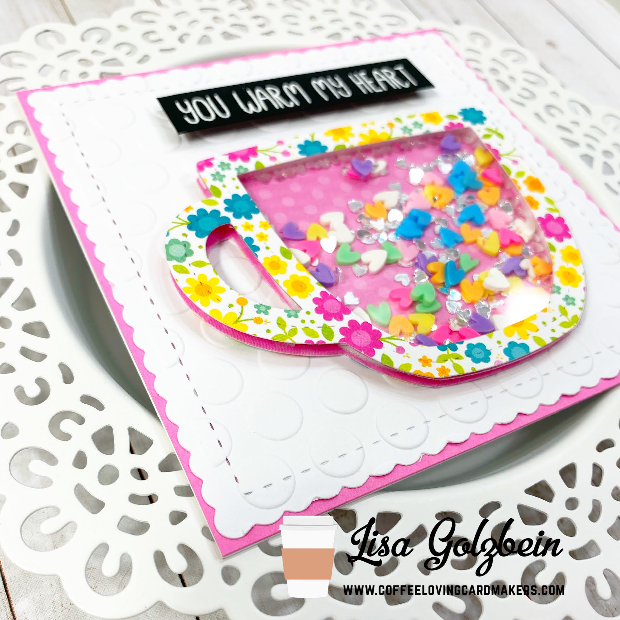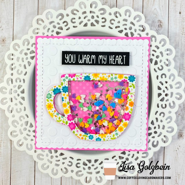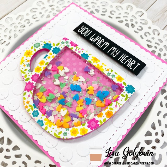 Welcome back to the Coffee Loving Cardmaker’s blog! It’s Lisa from Oh So Cute By Lisa here with you today and I have a card to share using two adorable dies from Lawn Fawn. The Outside in Stitched Mug and the Stitched Mug Frame.  These 2 die make the most adorable shaker cards and I filled the mug with some colorful Rainbow Heart Sprinkles from Kat Scrappiness. The pretty floral paper is from a Doodlebug paper pack.