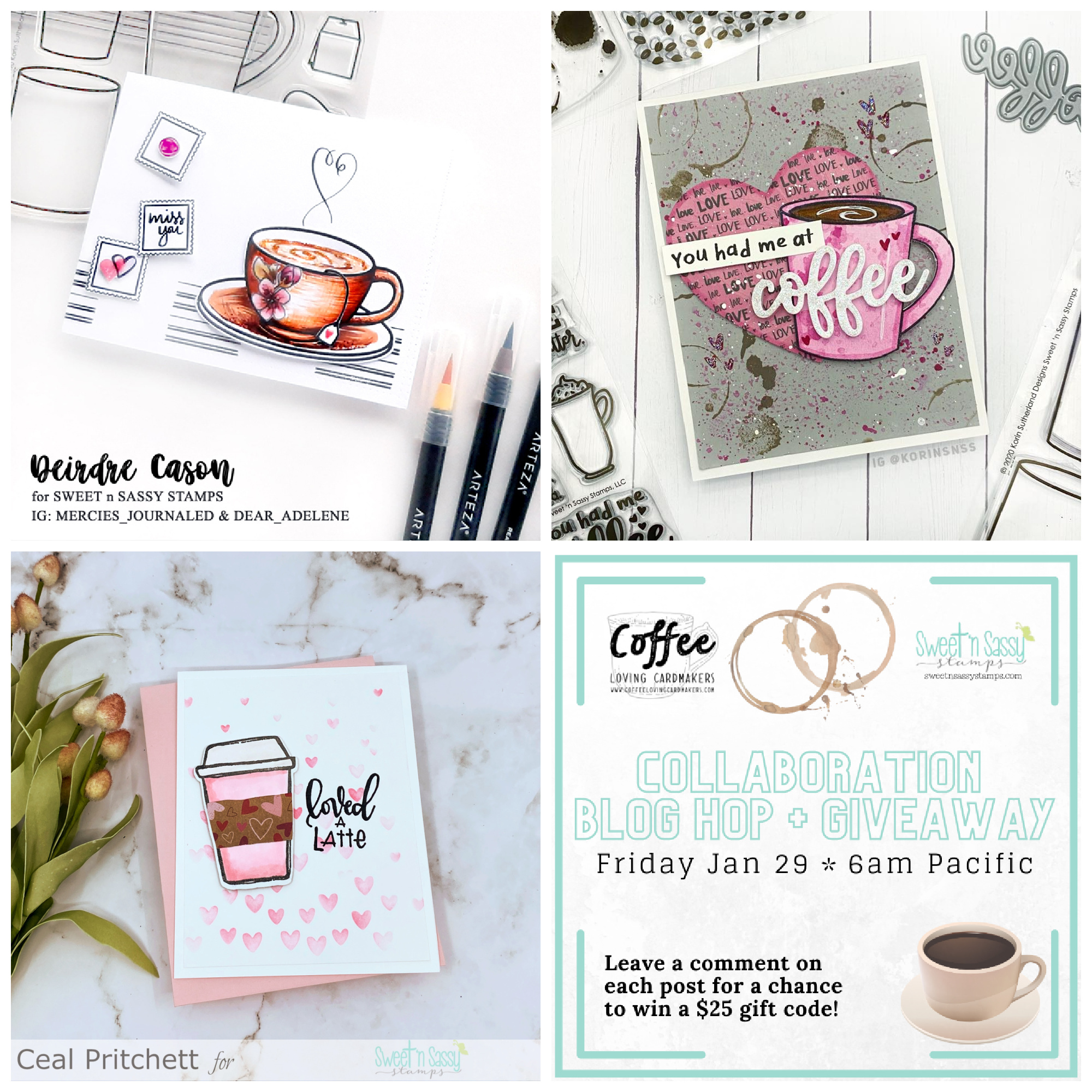 The Sweet ‘n Sassy Collaboration Hop is still going strong. The projects are truly amazing and inspiring, you don’t want to miss them. One lucky winner from across all the blog stops/comments will win a $25 code to Sweet ‘n Sassy Stamps! We will close the commenting February 5 at 11:59 pm pacific with a winner announced on both the Sweet ‘n Sassy and Coffee Loving Cardmaker’s blogs on Sunday the 7th.