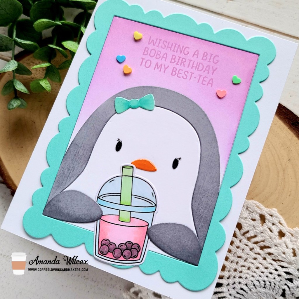 I simply started by die cutting the penguin favor bag add on from white cardstock and colored it with my copics. Then I had a fun idea to add it to a frame so I pulled out my Avery Elle wonky scalloped frames and cut the largest from teal cardstock. I inked up the center part that the frame cuts out with a couple of purple inks and my blending brushes and decided my penguin needed to hold something. My mind immediately went to the super fun boba tea set so I went to work stamping and coloring one of the cups. I used the coordinating dies to cut it out and started assembling everything.
