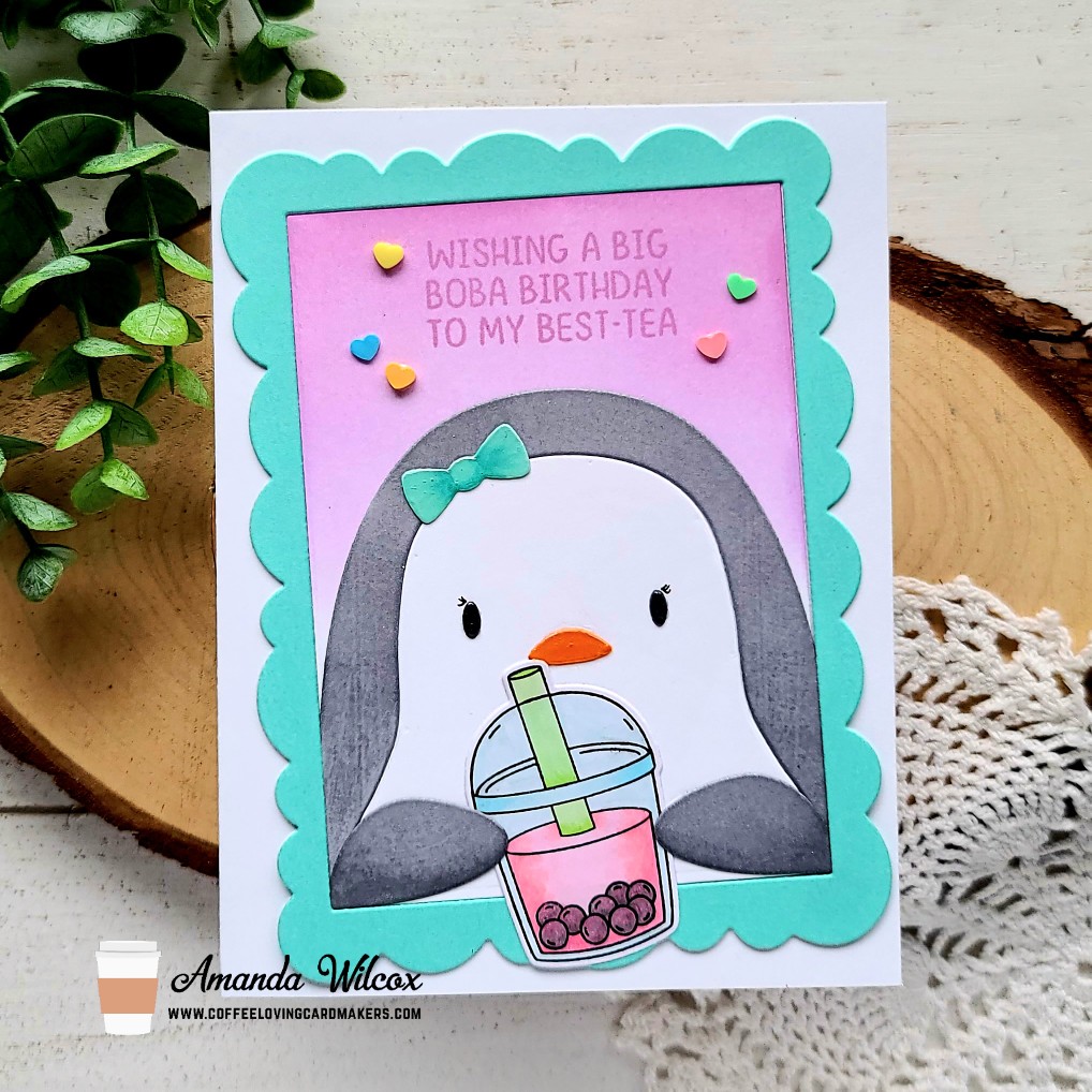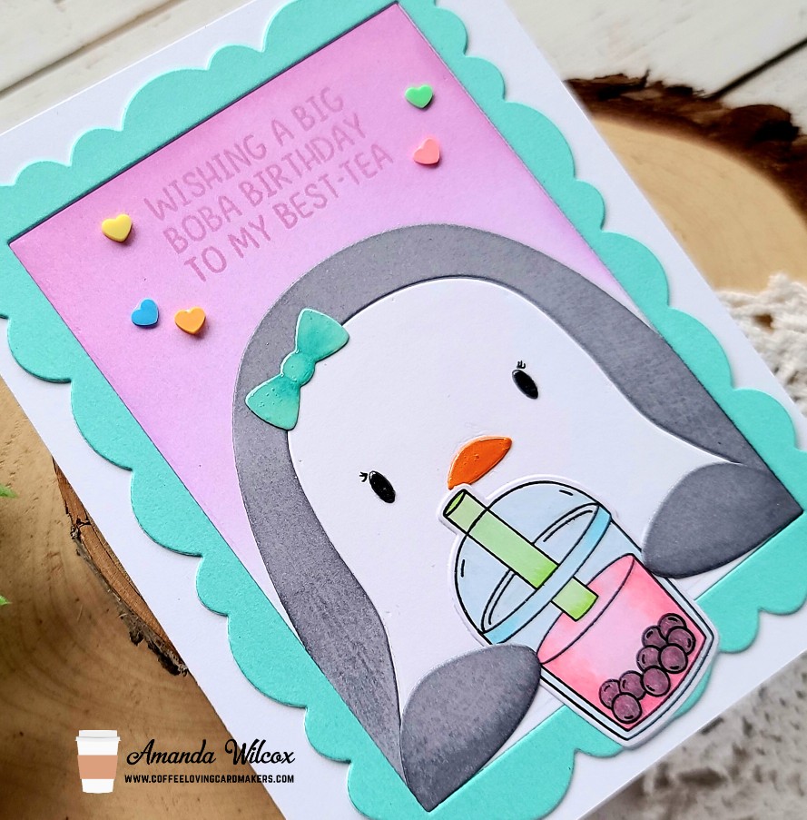 I found it easiest to adhere my penguin to the inside frame panel and then adhere it to the card base. Then I added the frame around it because it overlaps the side of the penguin just a bit. I carefully tucked the boba cup in the penguins hands and glued it in place. Then I popped the whole thing in my MISTI and stamped my sentiment in the same purple ink that I blended on the panel.