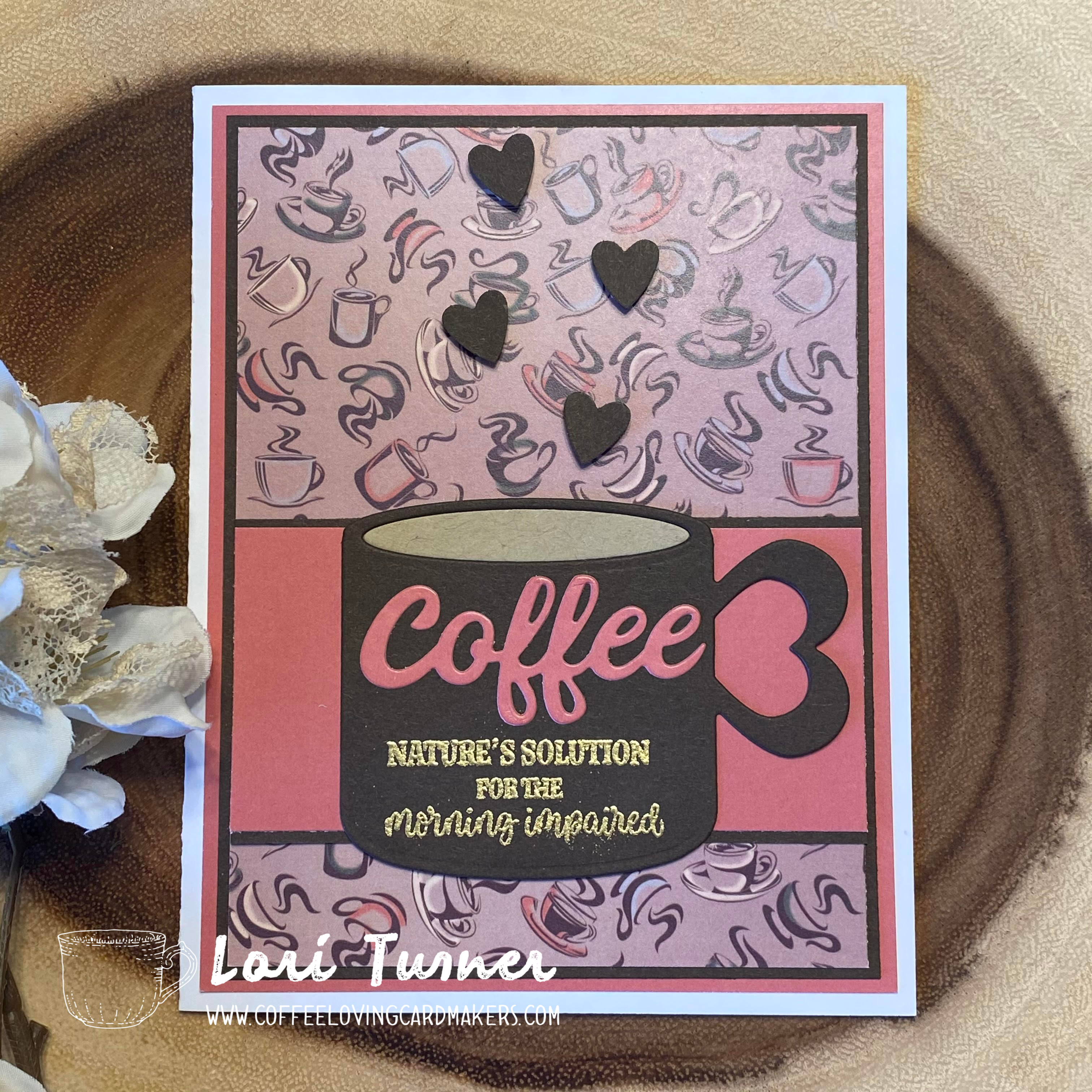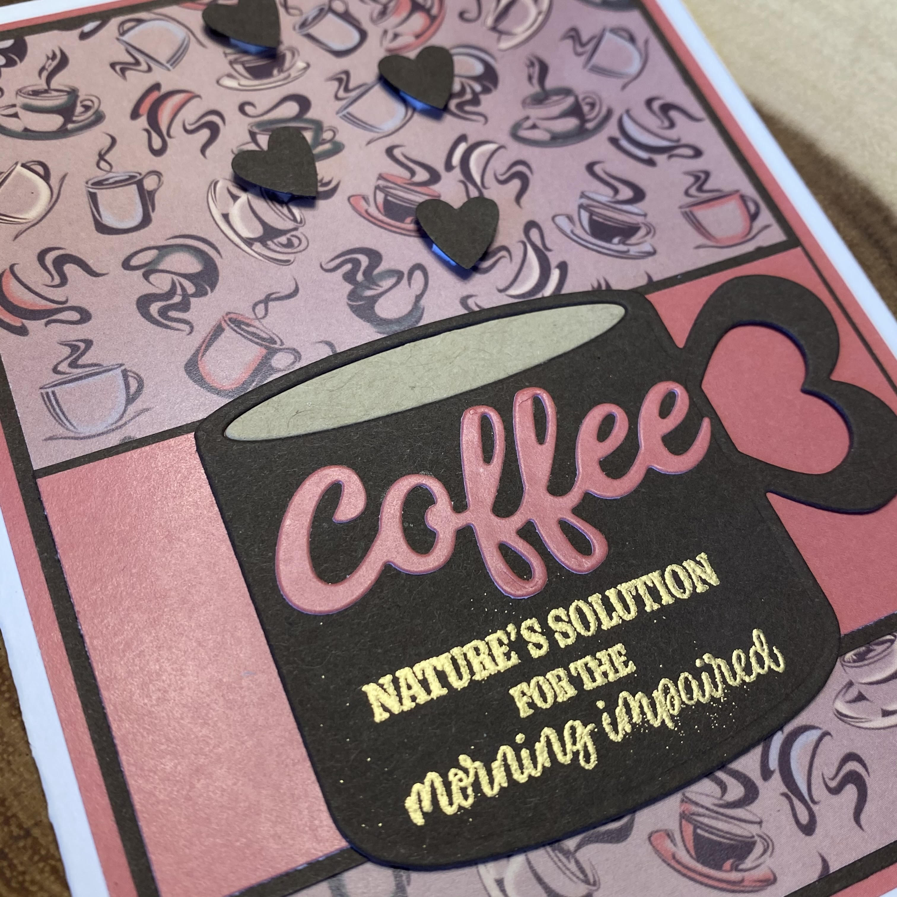 I really love this coffee cup die – there are so many variations you can do with the stamps/die. I added some punched out hearts for the “coffee steam” and I used gold embossing powder for the sentiment