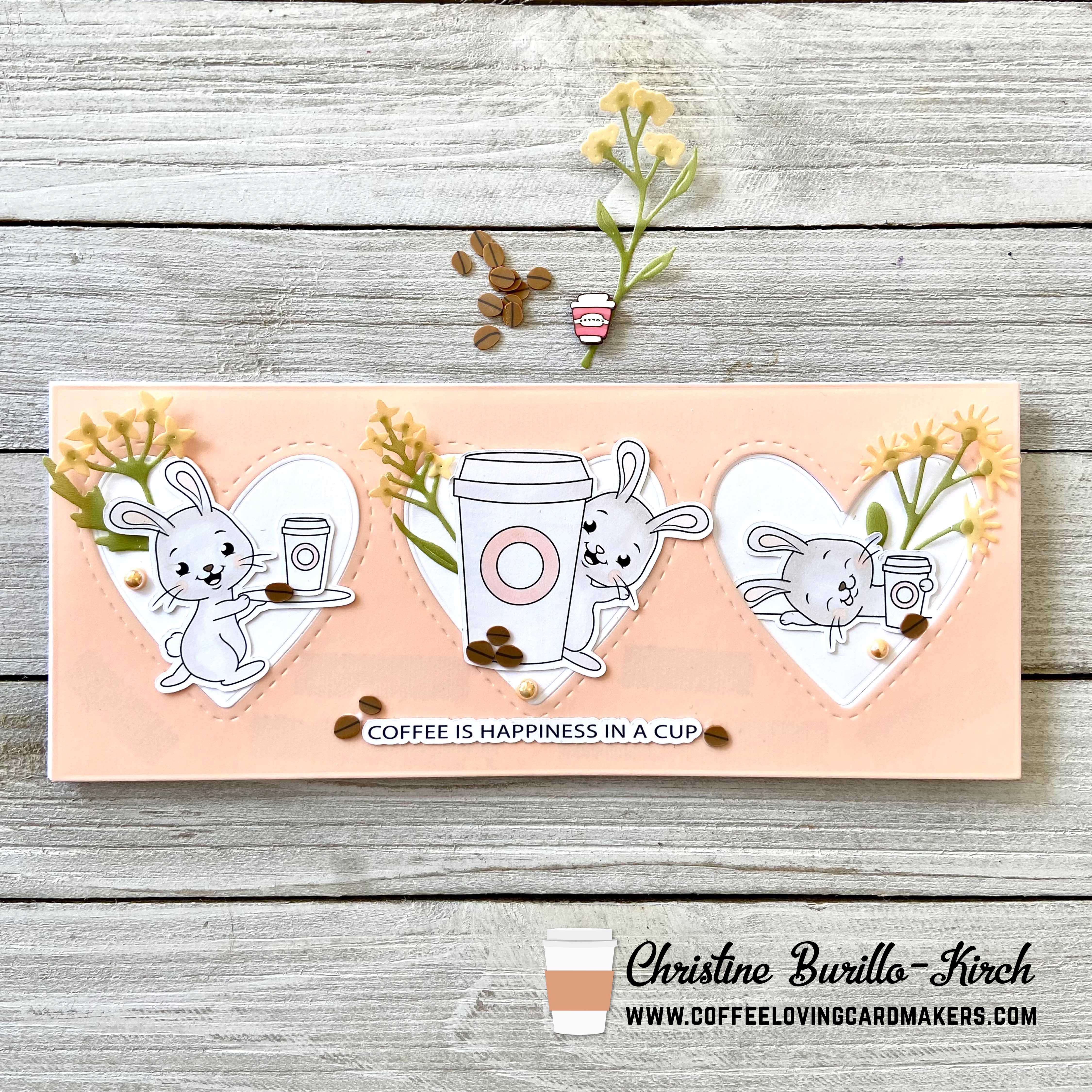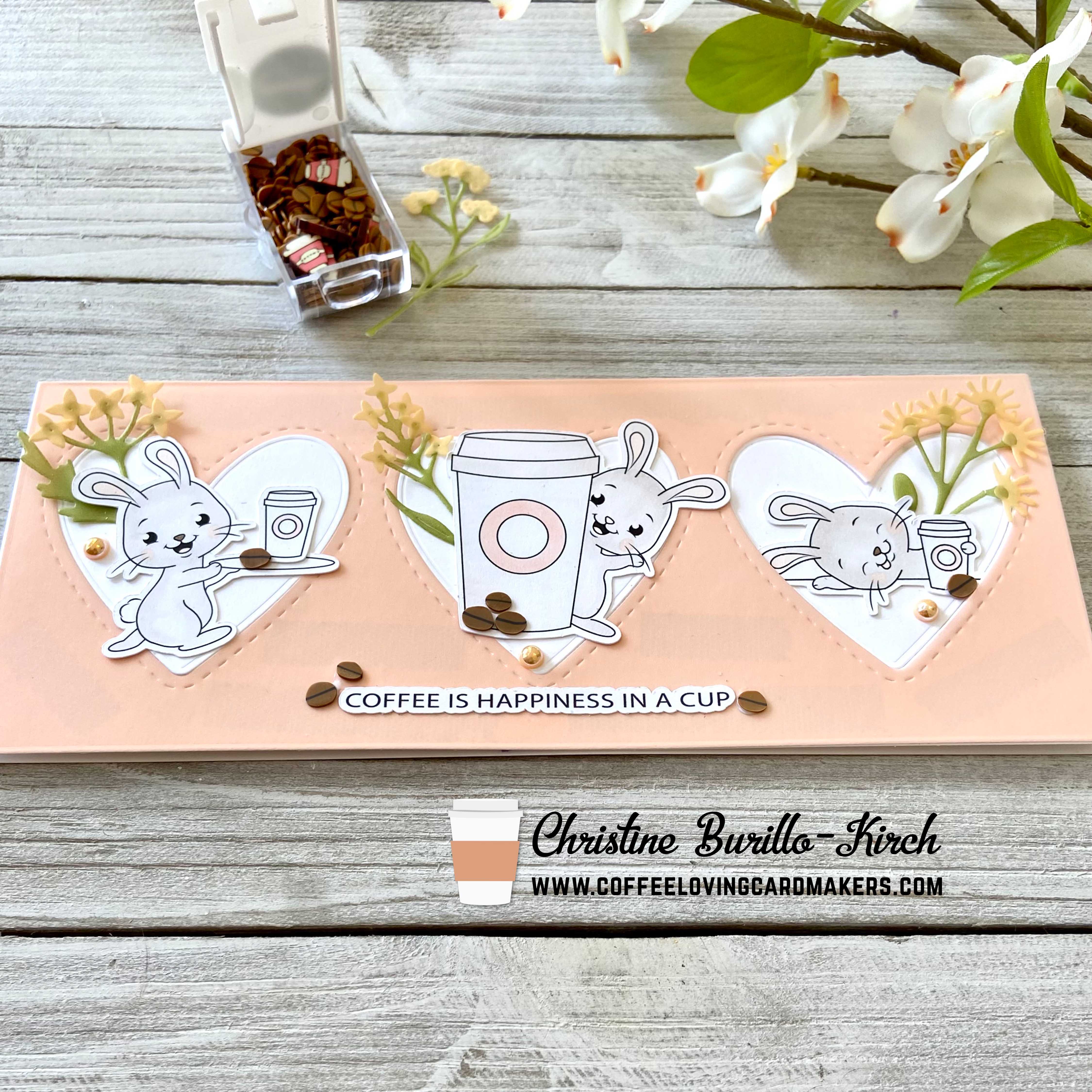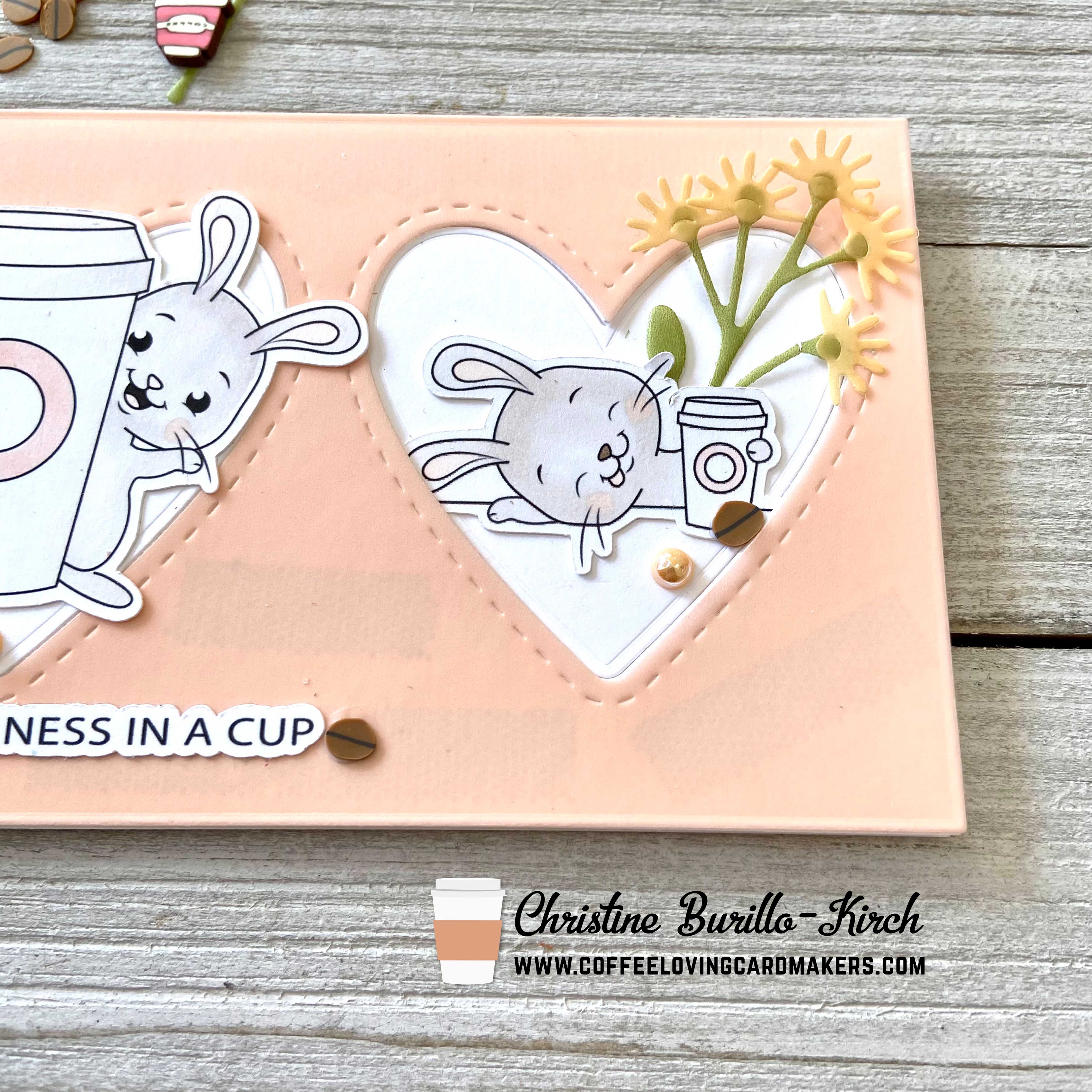 I first made die cut the images from the digital stamp Coffee Bunnies from IsabelCristina Stamps using my Silhouette. I then did simple copic coloring with W0 and R00, as I wanted to keep the bunnies a lighter shade.