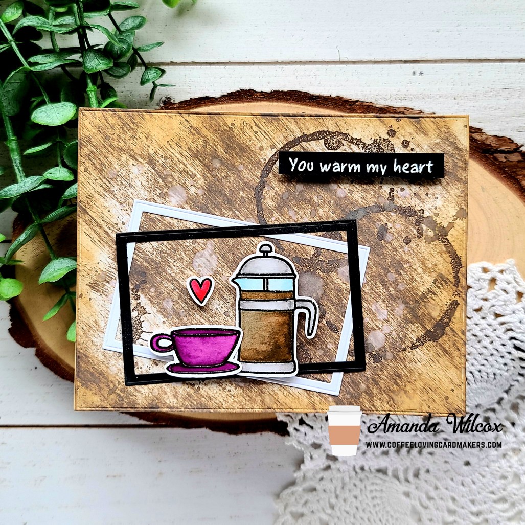 For this first one, I inked up a white panel with ground espresso distress oxide by dragging the pad across the paper. Then I used gathered twigs distress oxide around the edges. I spritzed it with water and die cut it with Super Sponsor Trinity Stamps’ embossed edge rectangle die. Next, I dug out a very old Bo Bunny stamp set and stamped the coffee stain rings on the panel with ground espresso distress oxide ink. Then I chose 2 smaller embossed edge rectangle dies and cut out frames in white and black and glued them down with liquid glue. I popped up my images with foam squares. Last, I stamped and heat embossed a sentiment from Coffee Time, cut it into a strip and popped it up as well.