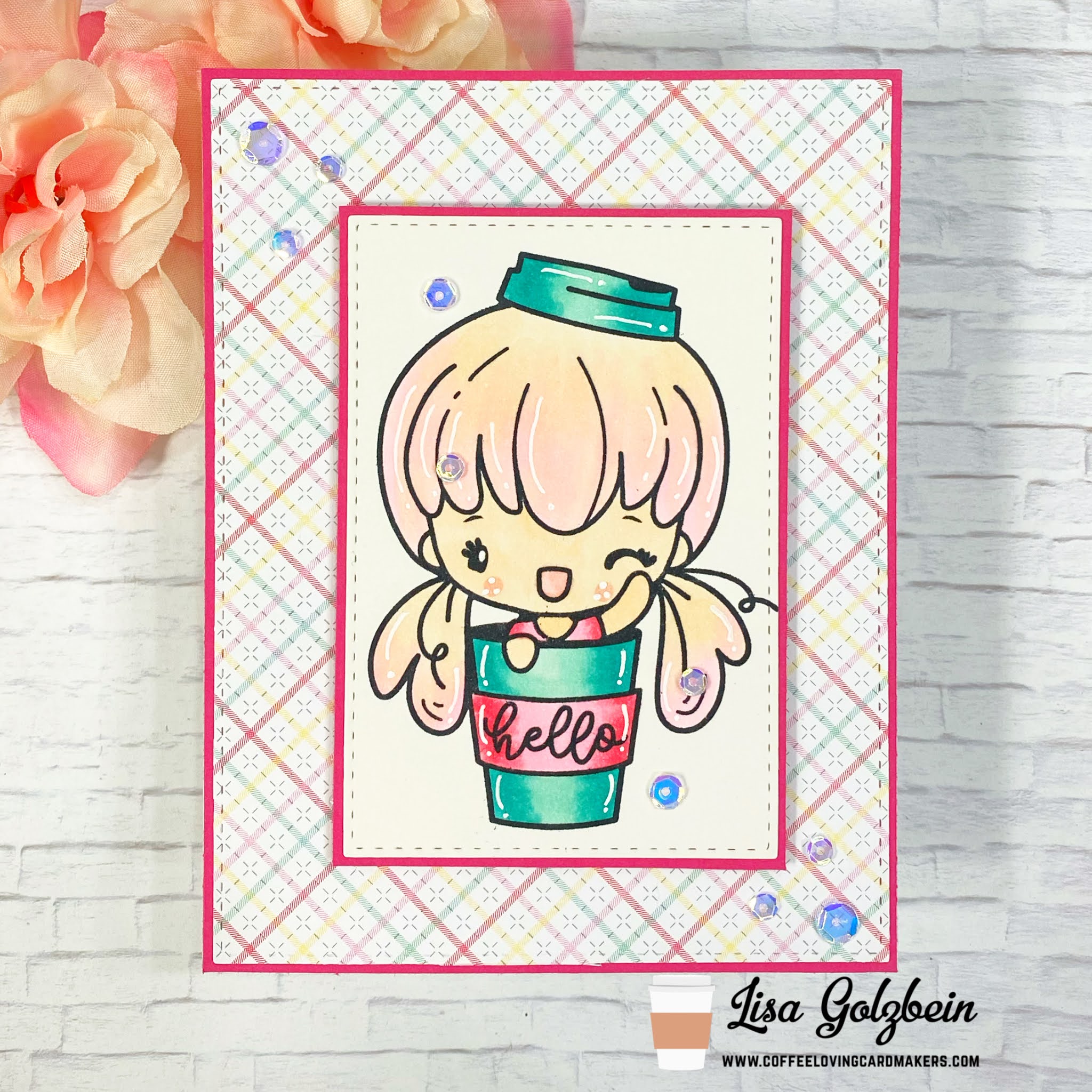 Not only did I fall in love with Suzanne’s card but I ordered the stamp and picked her card as my designer pick at the end of the hop! The adorable stamp is called Coffee Cup Anya and it is from the Greeting Farm. It’s an older stamp but I was lucky enough to find it at Simon Says Stamp.