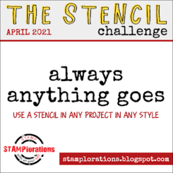 That’s my mixed media tag today. I hope you all enjoy it, too. I link up this tag at STAMPlorations April Stencil Challenge and Never-Ending Anything Goes Challenge. Check out all the challenges at Super Sponsor STAMPlorations Blog this month.