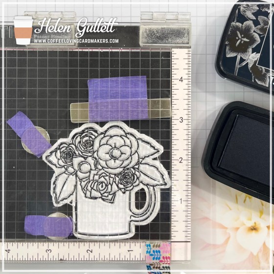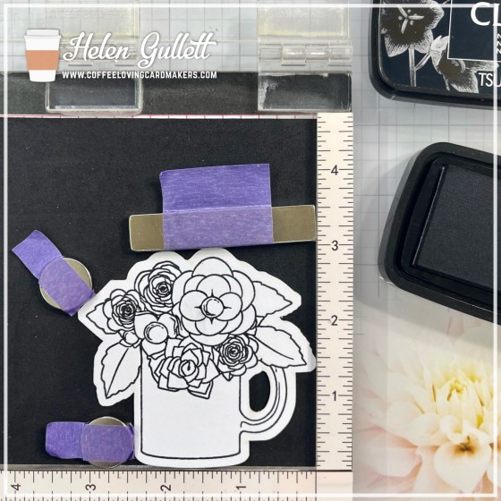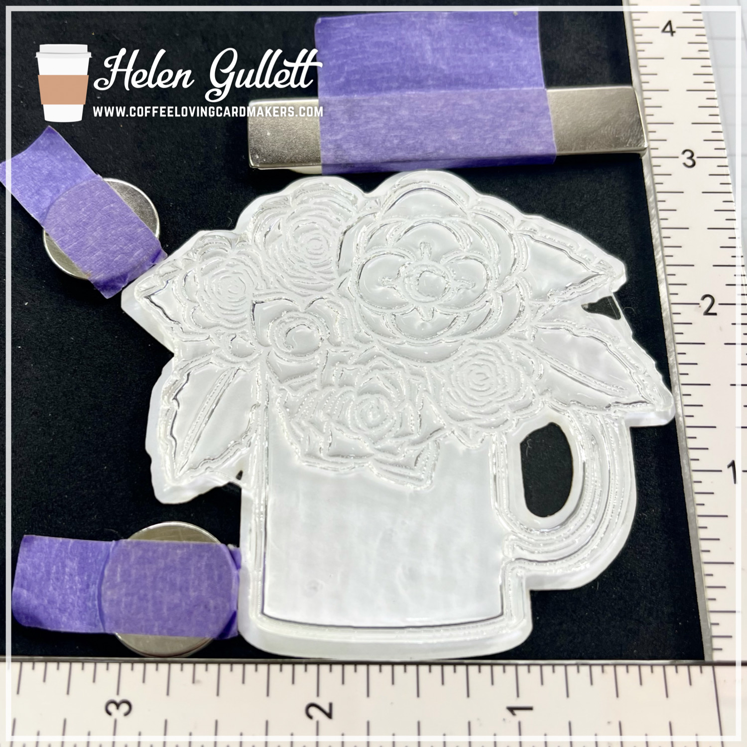 I started with stamping the cup of bloom image from the A Cupfull of Blooms Stamp Set on the laser cut shape. I one of the A Cupfull of Blooms Laser Cut Shapes on my mini MISTI. I used the magnets to secure it in place. And then I line up the stamp on it.