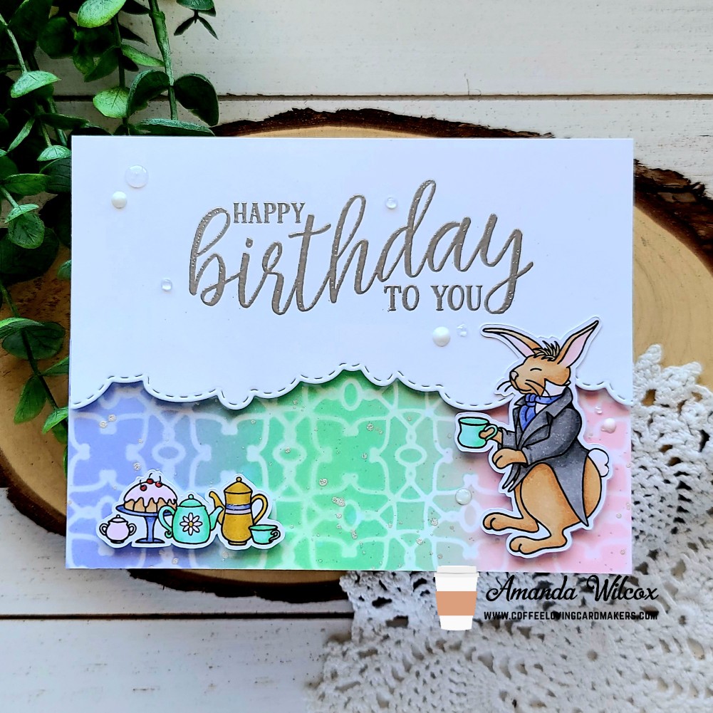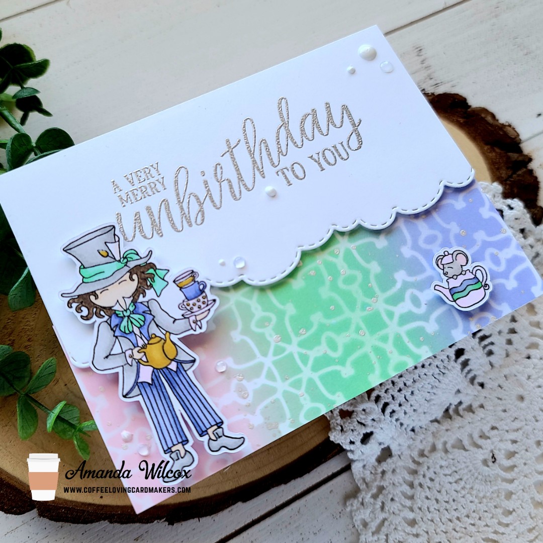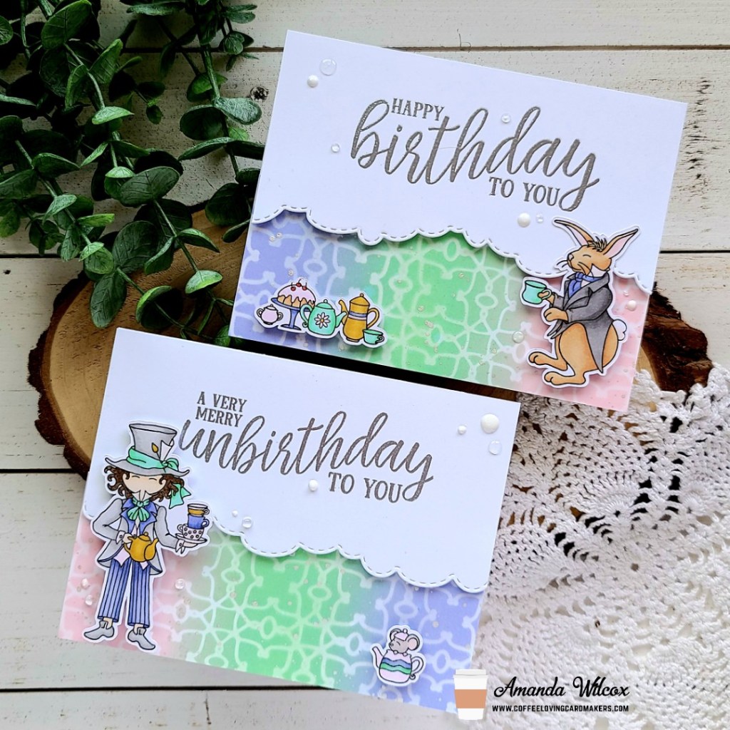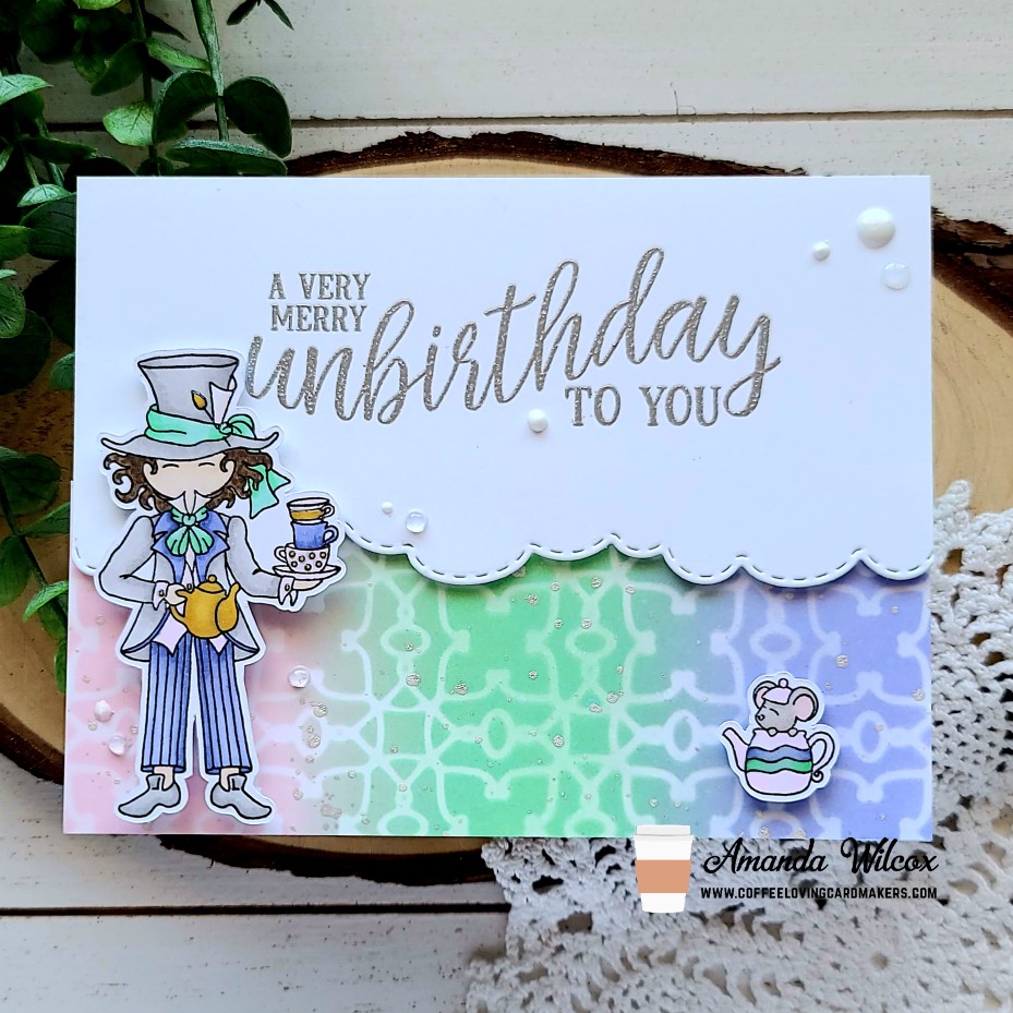 I pulled out the Unbirthday sentiment set and stamped and heat embossed each one in silver on white cardstock panels. Then I came back with the Trinity Stamps scenic border cloud die and cut off the bottom. I added foam tape to the back of these panels and set them aside too. Next, I stamped images from Tea Party and colored them with my copics. Then I used the scan-n-cut to cut them out and started assembling my cards.