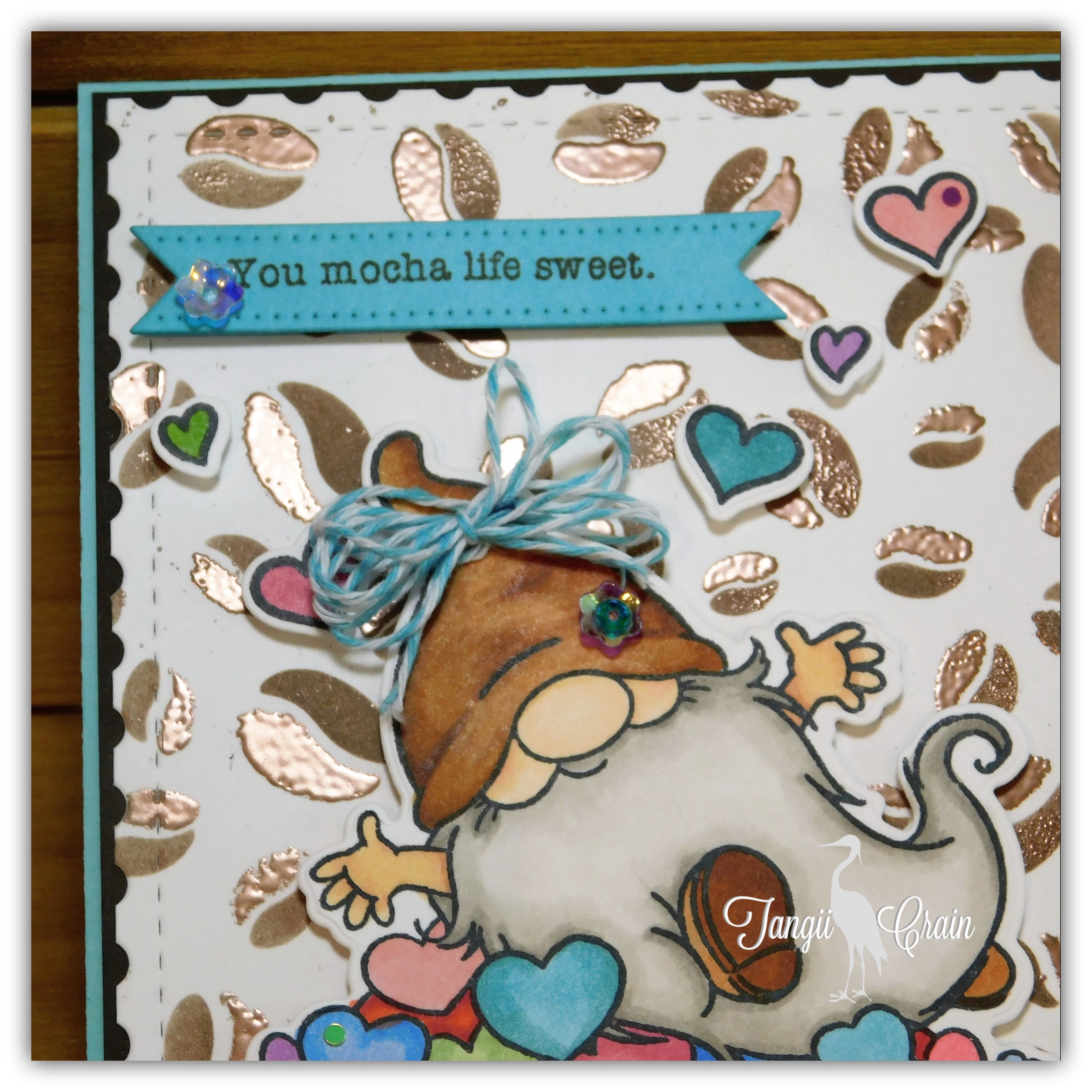 Hello & happy Friday! I’m so very excited to be a Guest for CLC today! Did you get a chance to participate in the Spring/Summer Coffee Lovers hop in March? Or to poke around all of the amazing entries? or pay a visit to any of the wonderful Super Sponsors? I just LOVE seeing the things people create and enter, but one of the very best things (for me anyway) is discovering new stamps and companies. Each hop I poke around the companies (from the entries as well as the Super Sponsor list) and find some that are “new to me” and place an order from a couple of them. One of the companies I’ve fallen in love with is Trinity stamps, in fact I’ve already placed a couple of orders with them (shhhh, lol). I was immediately drawn to the idea of pairing up this Falling For You Gnome and their Layered Coffee Bean Stencil together!