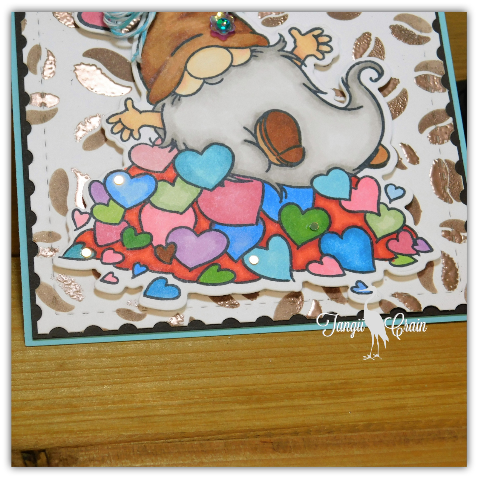 There are 2 layers to this stencil, the first has 1 half of the bean and the 2nd has the other half. I started by blending some Distress ink on the 1st layer, then for the 2nd layer I used some Embossing ink and Nuvo Copper powder. I love the look and mix of texture! I colored up my lil Gnomie with Copics and used the coordinating die to cut him out.