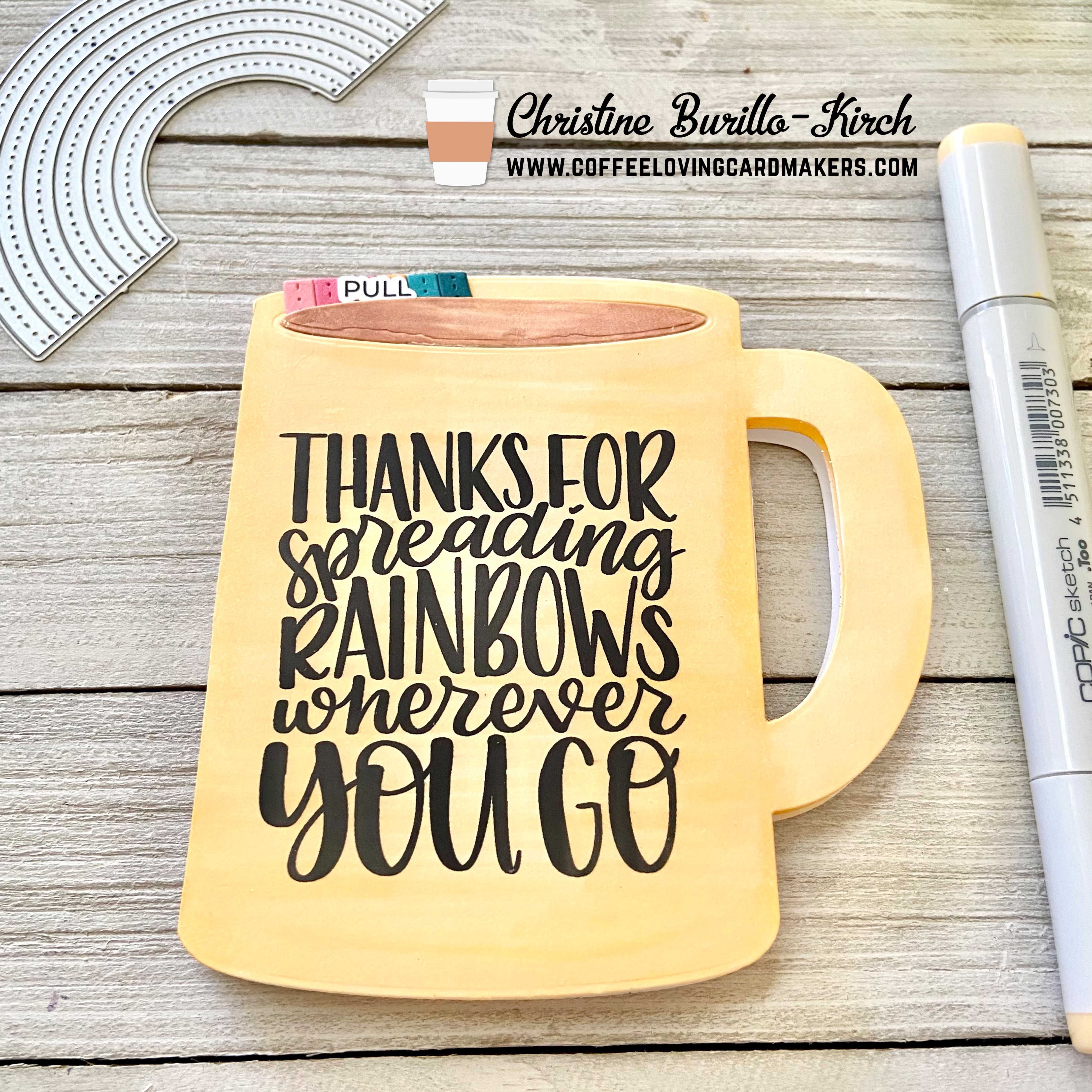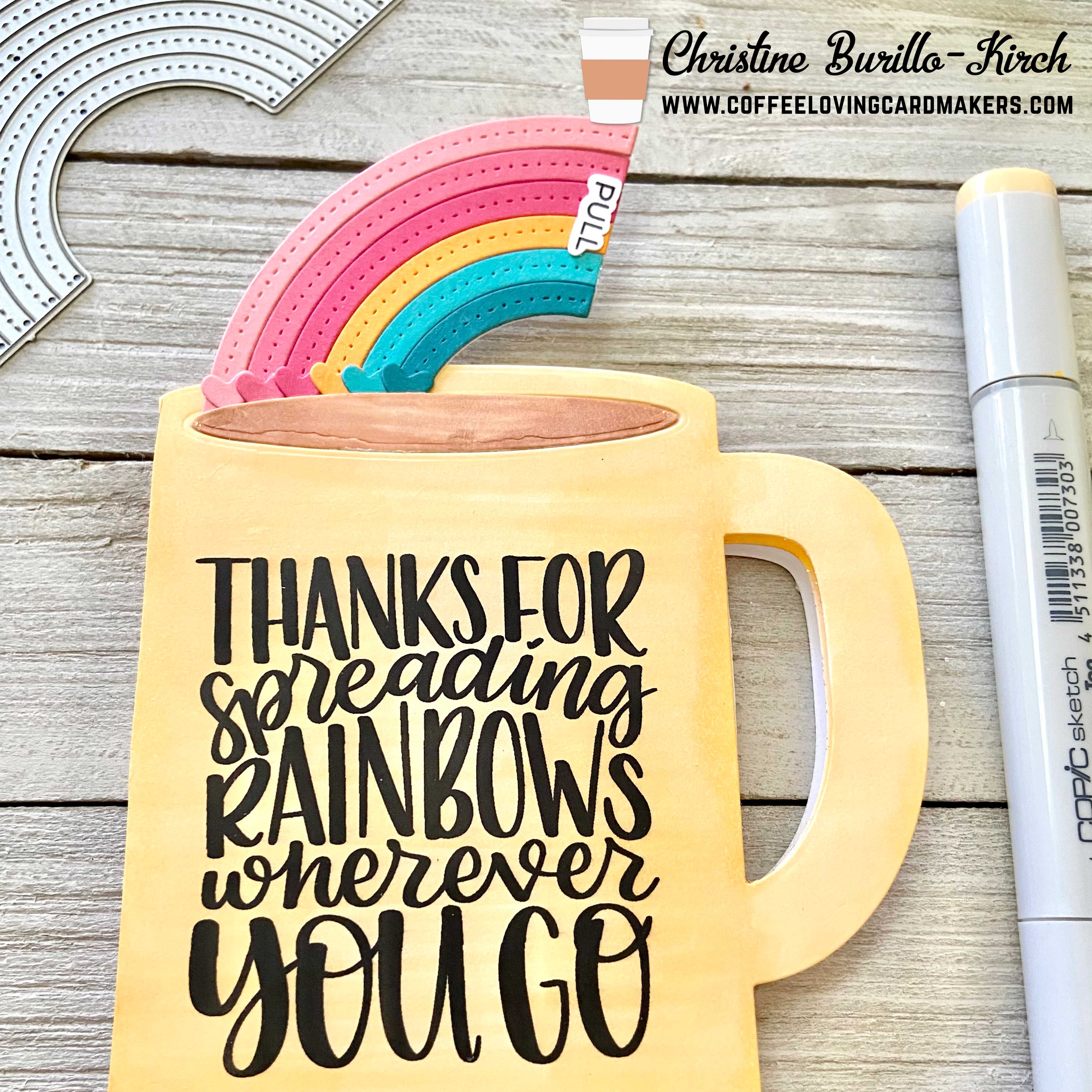 Happy Mother’s Day! Hello there, Christine here with an interactive rainbow coffee card that uses a freebie that Super Sponsor Catherine Pooler sent out this week to email subscribers to spread some cheer! I paired it with the amazing Trinity Stamps Rainbow Funshine and Coffee Mug Card dies.