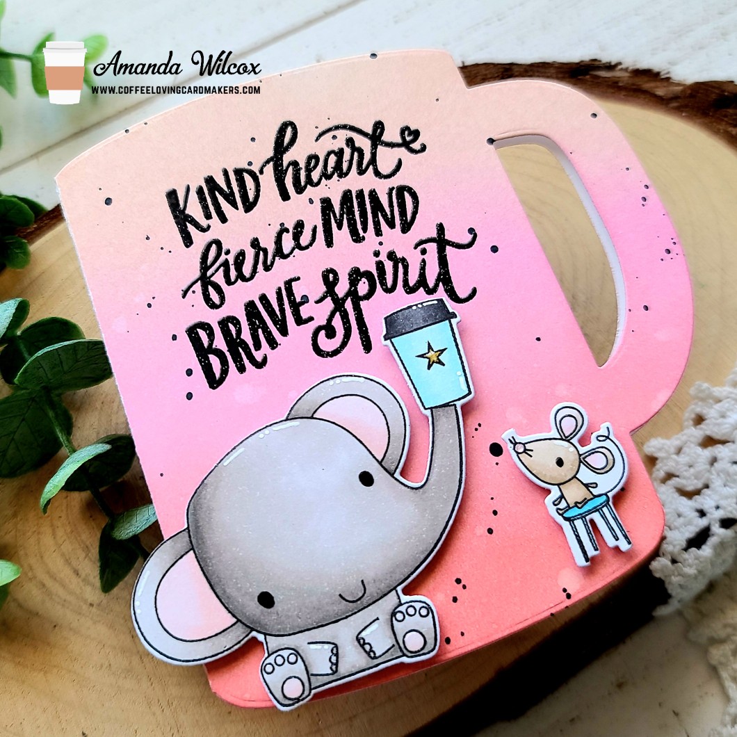 I stamped and colored images from the Reverse Confetti Coffee and You stamp set. I used the coordinating dies to cut them out and set them aside. Now that my panel was dry, I stamped and heat embossed a sentiment from My Tribe in black. I added foam squares to the elephant and mouse on the stool and added them to the front.