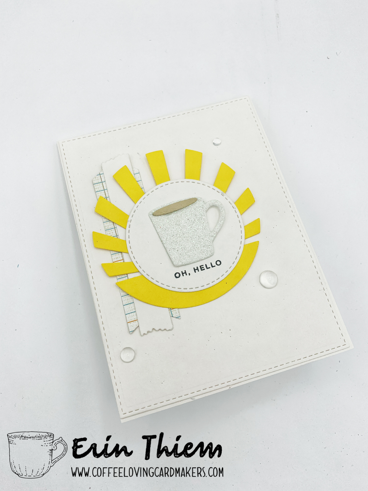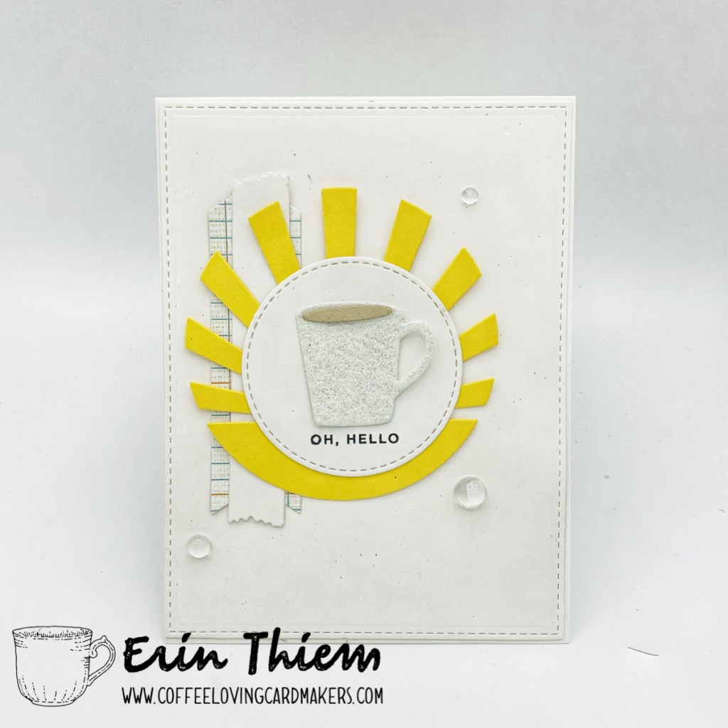 Oh hello… Erin here with a card inspired by this week’s MFT Sketch Challenge for my Creative Chaos post. My crafting space has taken over all of the floor (which it’s sharing with 2 laundry baskets of clean laundry). Oh hello coffee. The card pairs MFT dies, Papertey Ink sun rays die, Studio Katia clear drops and a sentiment from Simon Says. Hope your Saturday is full of play and you can ignore the clutter.