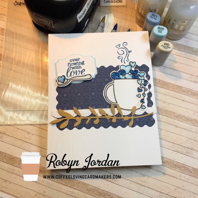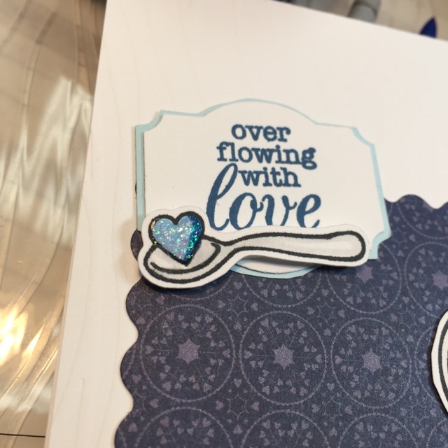 It’s my turn on the blog today and I have this pretty card made with stamps from Hero Arts. The set is called “Cup of Love” by Hero Arts. It gives you five images and four matching sentiments. It’s got a cute little spoon and “steam” with hearts. It’s a lovely set!