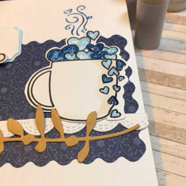 I used Copic to color in the little hearts (B000, B45 and I used W0 to highlight the cup). The stem under the cup is cut from kraft paper with a Sizzix die.
