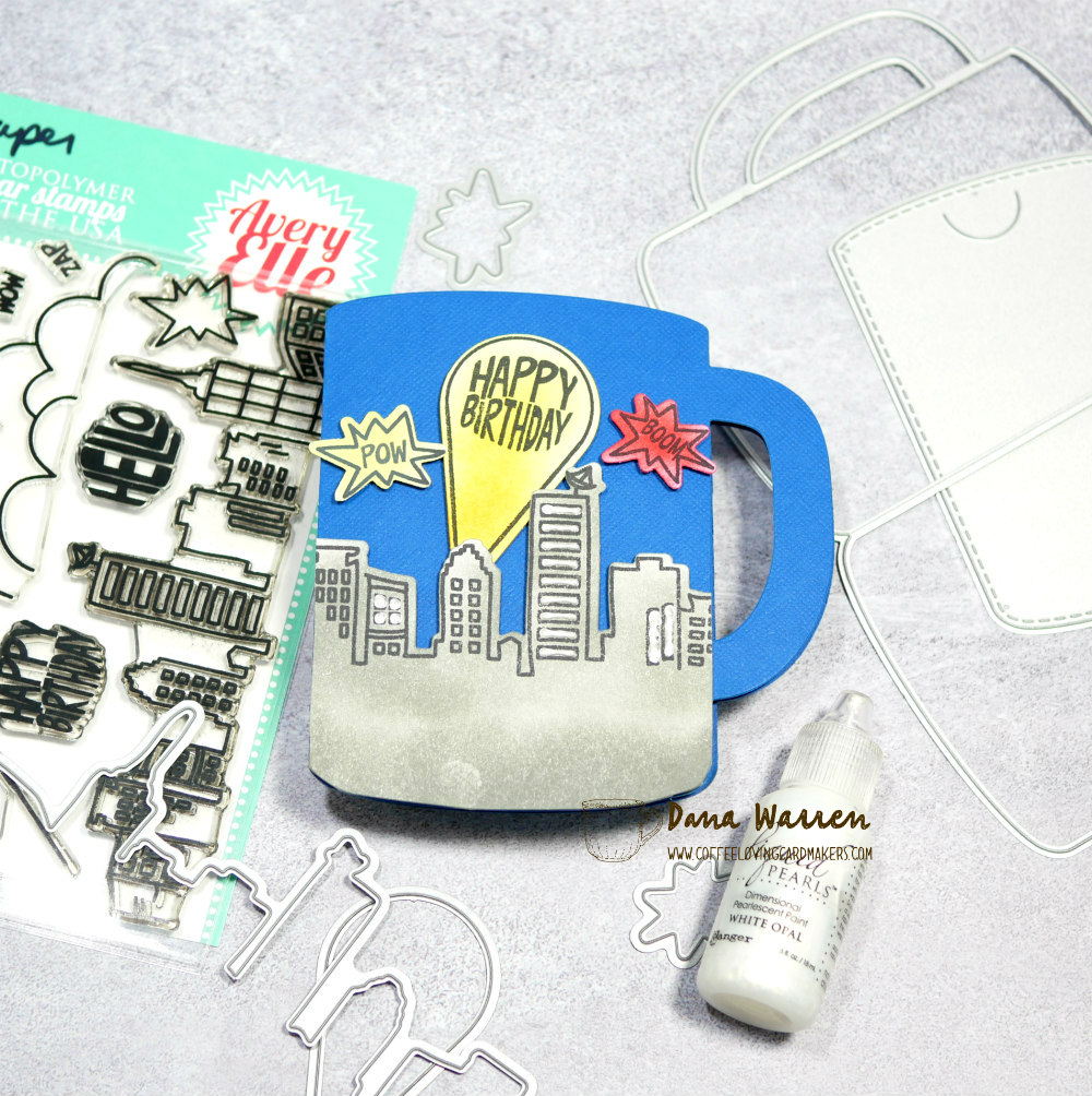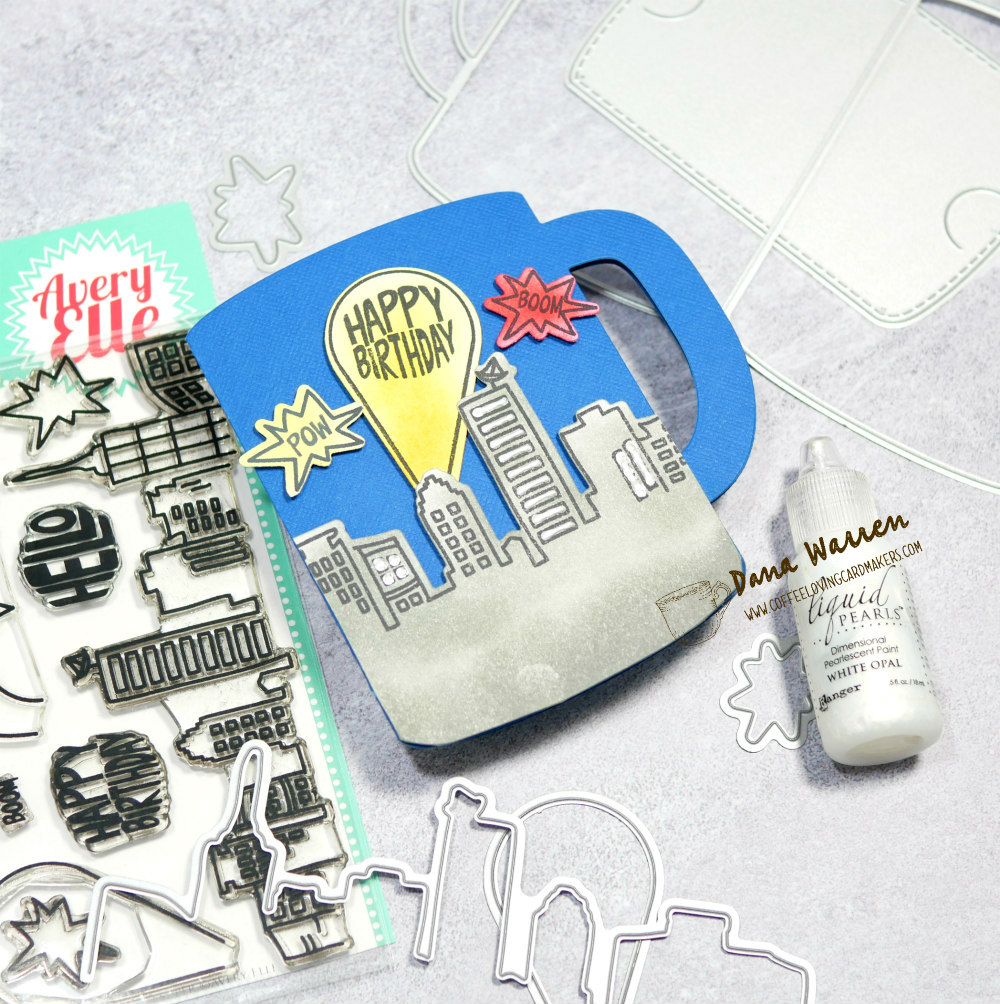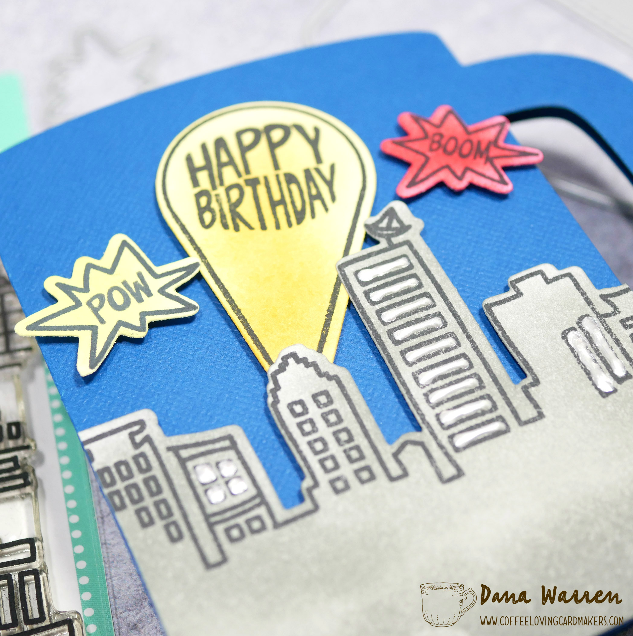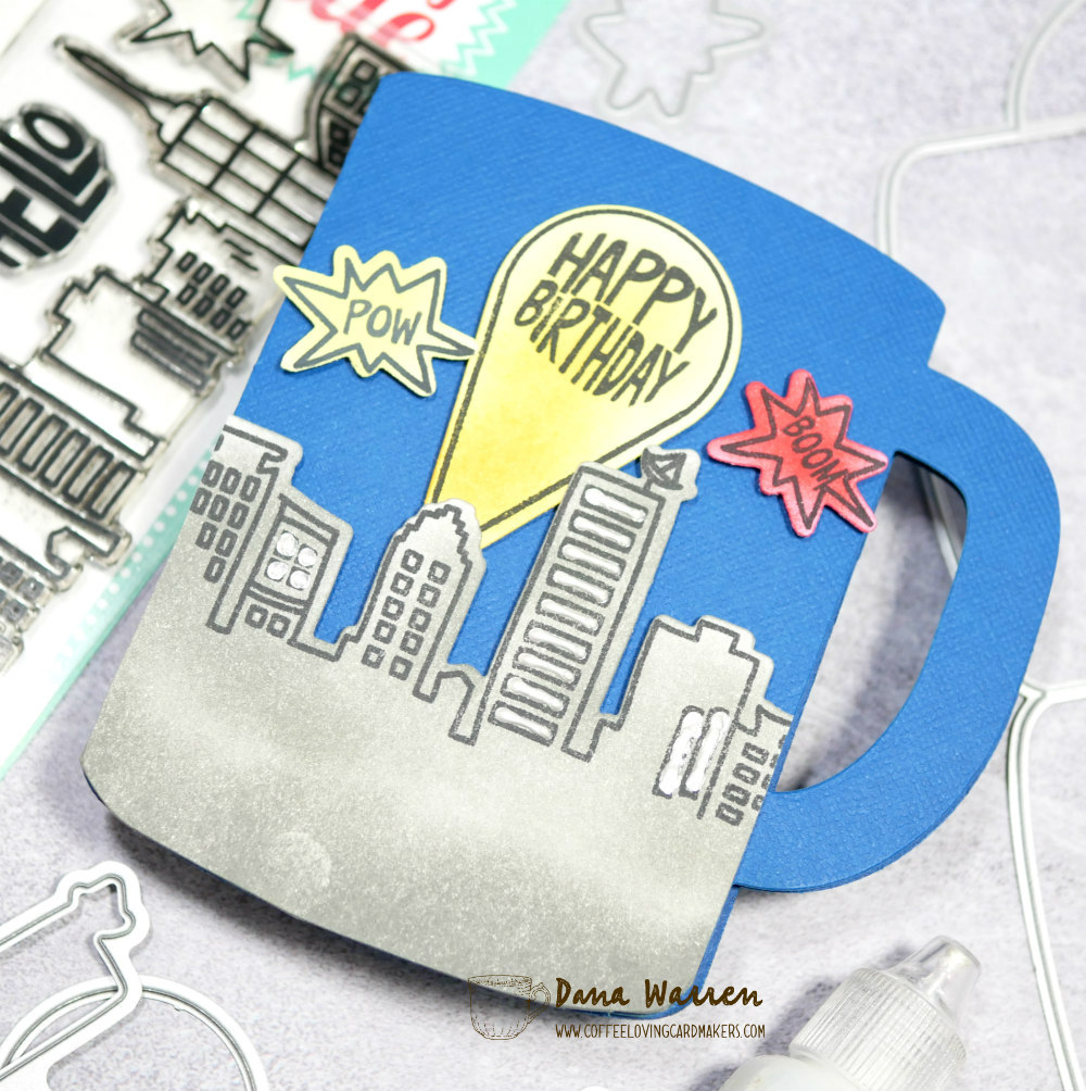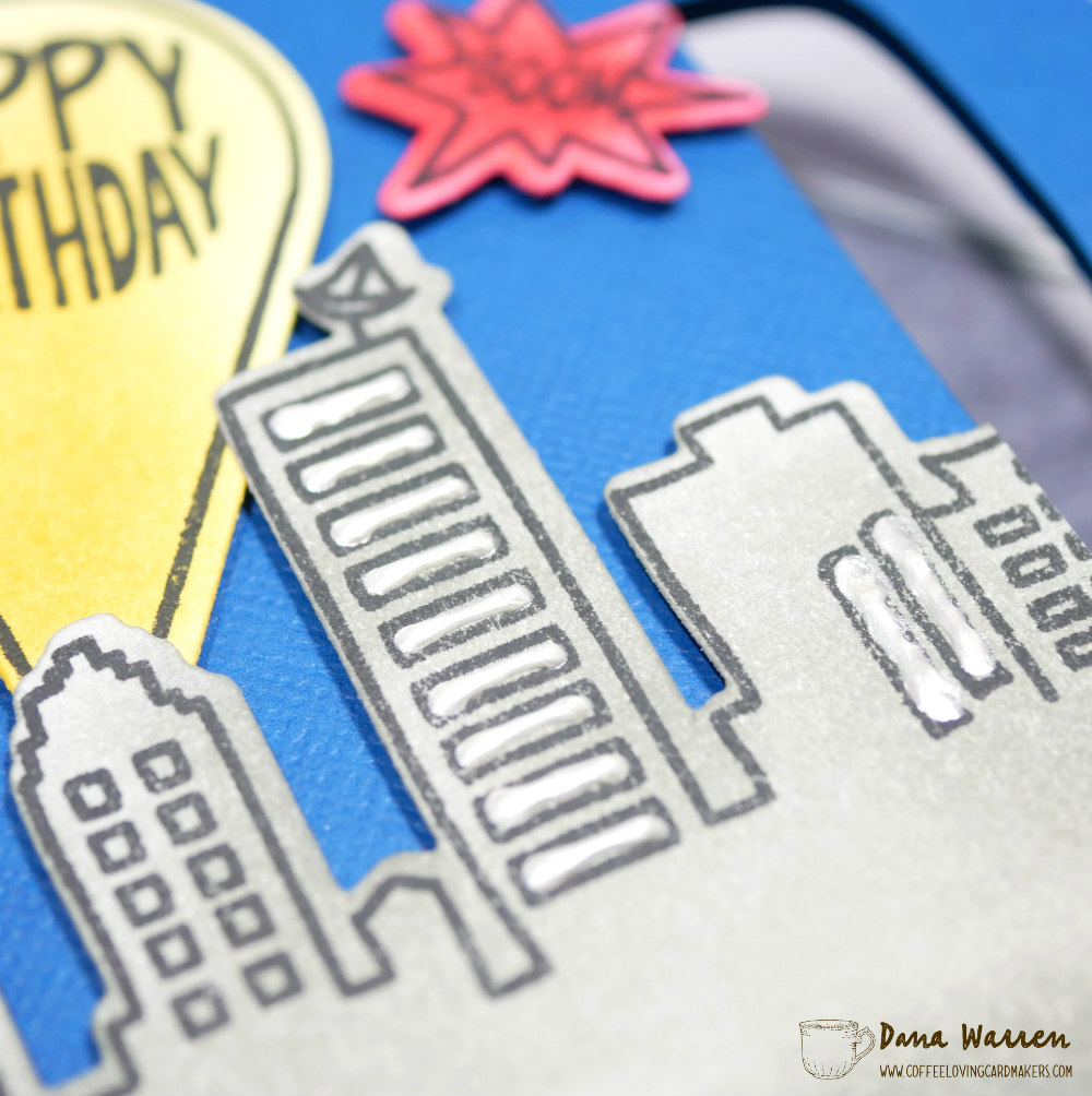 I stamped the skyline, spotlight, and two of the action speech bubbles. Next, I used various colors to ink blend color in each of these images. Then I stamped the Happy Birthday in the spotlight and the action words in the speech bubbles. I used the matching dies to cut everything out. For a little added dimension I added white Liquid Pearls to some of the skyline windows.