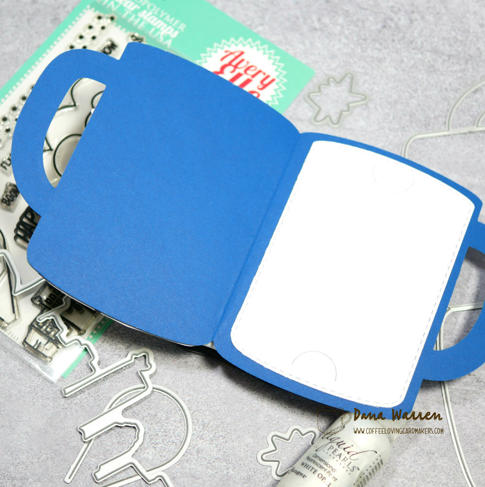 While my windows were drying I used Trinity Stamps Coffee Mug Die and cut a cup from blue cardstock. I cut the gift card slot from white cardstock and adhered it to the inside of the mug.