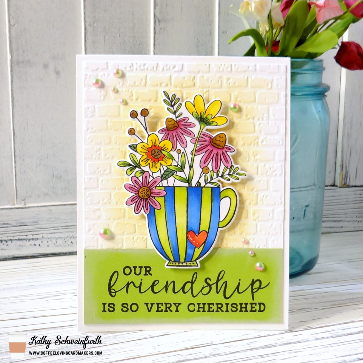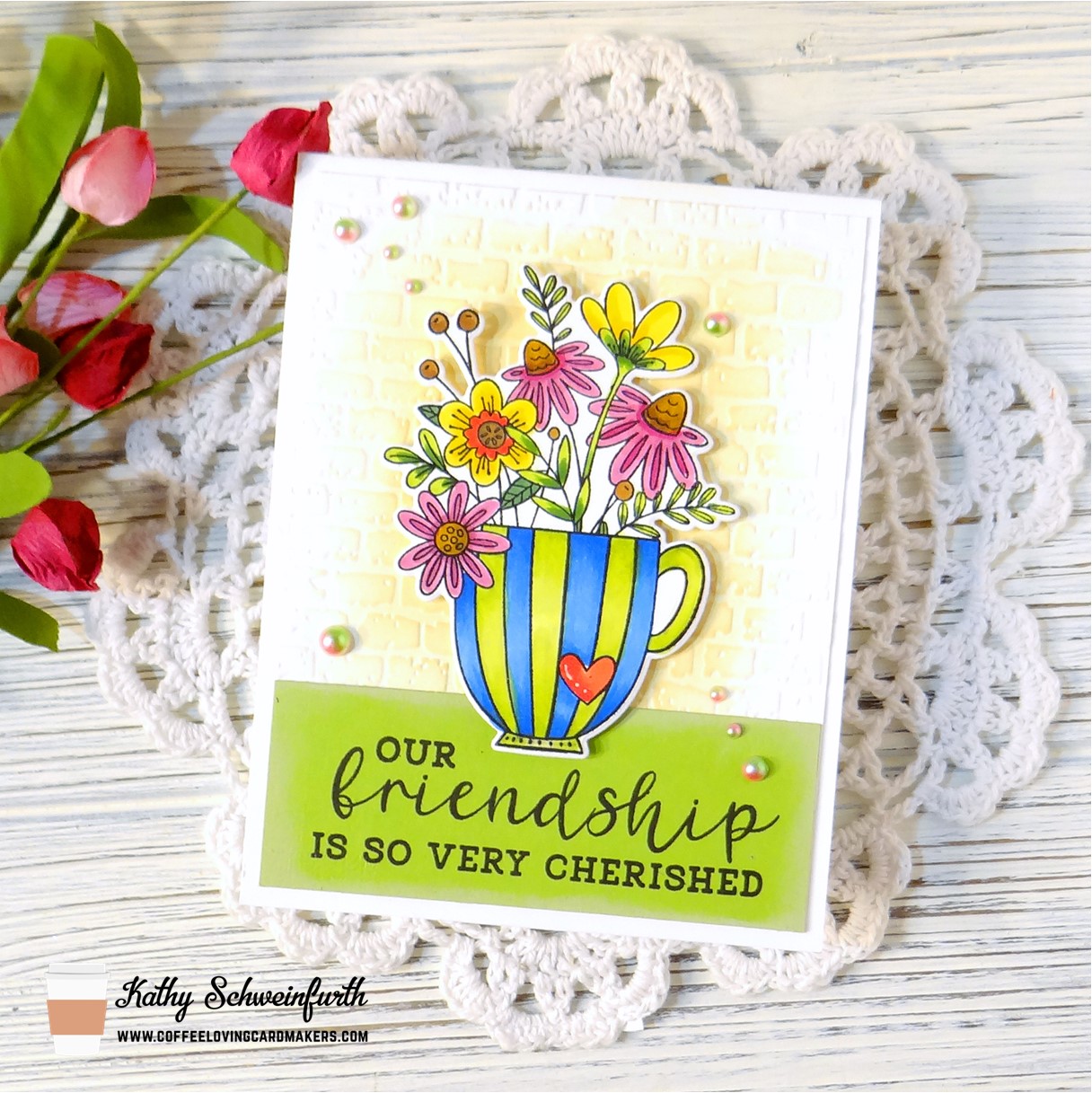 For my card, I used Taylored Expressions Brick Embossing Folder for the background and blended some Distress Oxide Antique Linen ink. The beautiful image and sentiment are from Reverse Confetti’s set: Cup of Friendship!