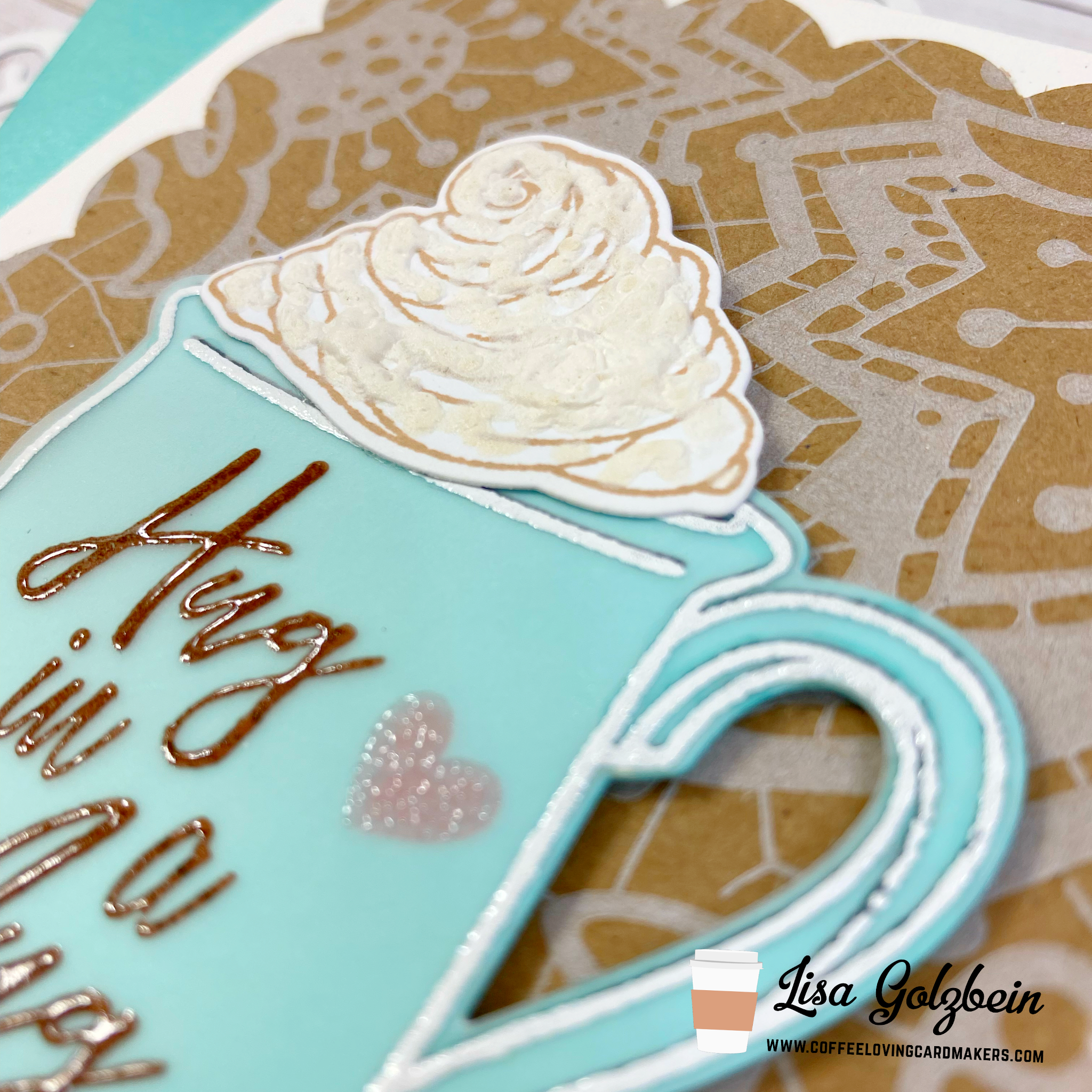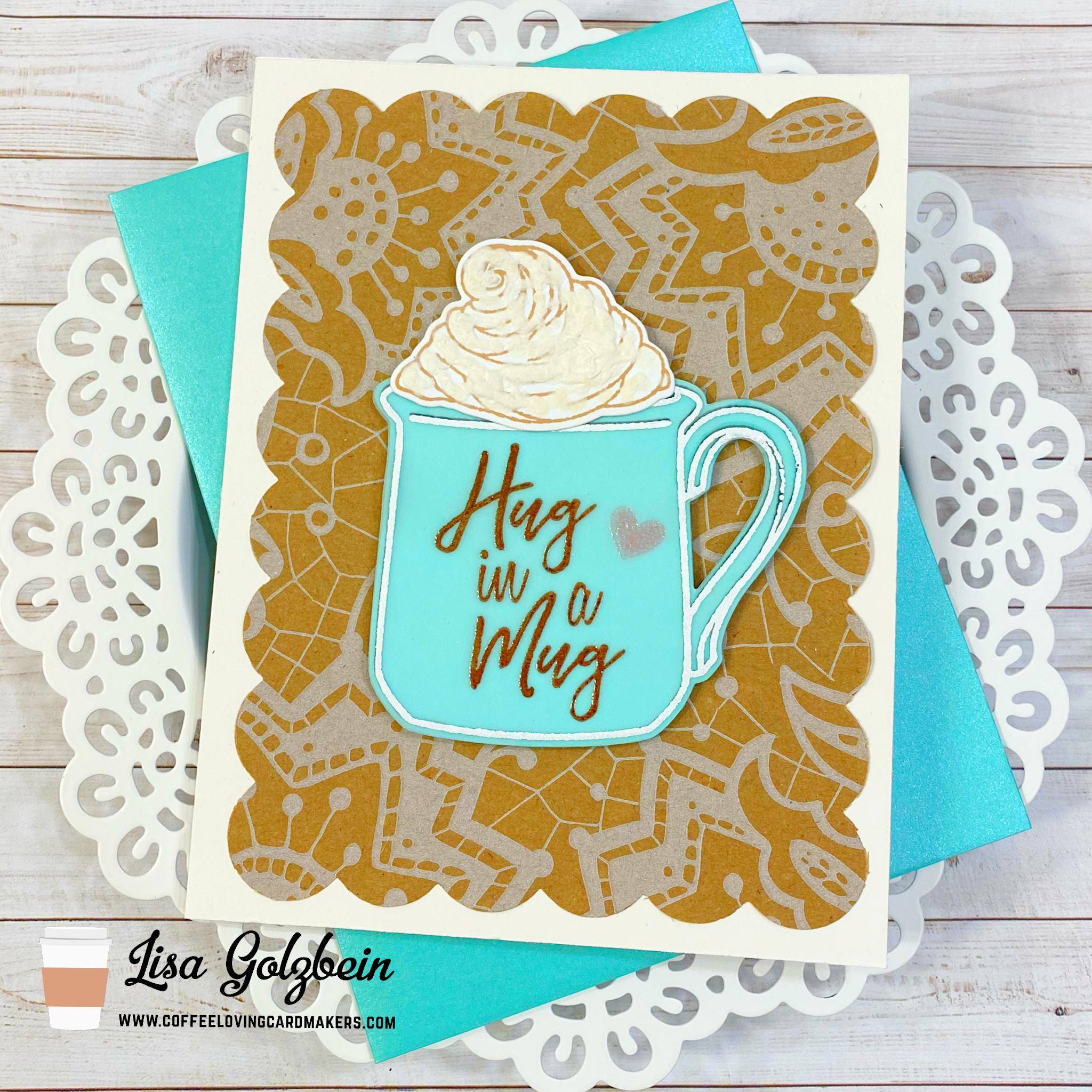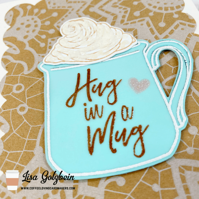 For the background under the cup I did some recycling. You might recognize the patterned paper under the cup if you’ve ever placed an order with Honey Bee Stamps. Their stamps and dies come wrapped in this super cute kraft paper and I’ve always wanted to include it in one of my projects. I just love the look of white on kraft. I used a scalloped rectangle die from Neat and Tangled to cut it out. I just love how it looks under the mug!