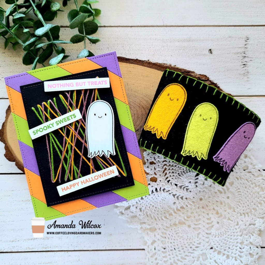 I couldn’t resist this super fun Halloween set from Ellen Hutson called Halloween Treat Tags. The ghost and bat in this set are beyond adorable! Today I’m just using the ghost for a super fun coffee sleeve with the Bear Cozy Kit and then switching gears to a card that coordinates!