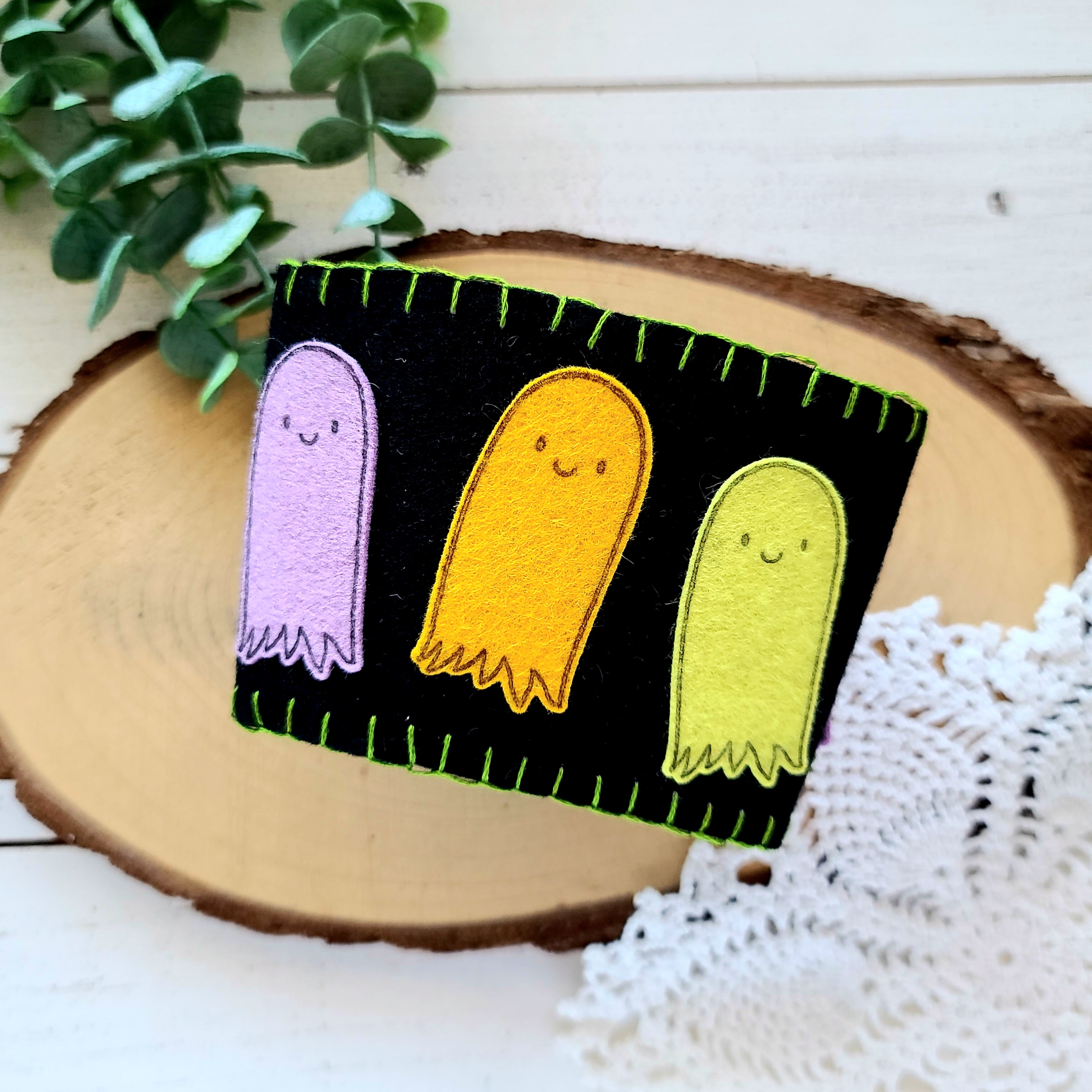 For the cozy, I die cut the bear cozy main die from black felt and trimmed off the ears with scissors. Then I cut the ghost from sprout, lilac and sunset felt. I placed the negative from one of the ghosts in my MISTI and used it to align the stamp. Then I simply placed each ghost in the negative and stamped the image right on it. I happen to have a craft ink pad for fabric but I did a little research and you can you Ranger Archival ink on fabric too! I used Thermoweb Fabric Fuse liquid adhesive to adhere my ghosts in place and set it aside to dry.