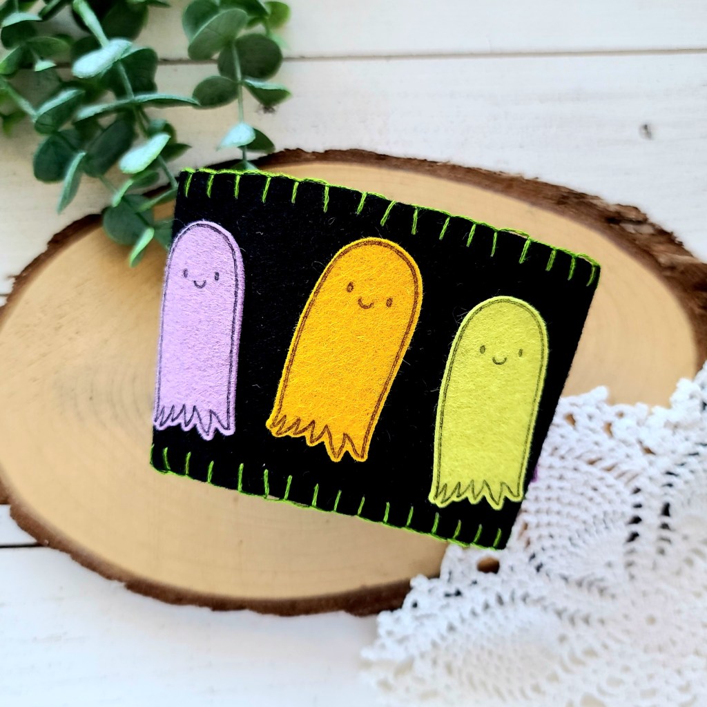 With my card all finished and the ghosts on my cozy dry, I used the stitching die to cut holes on both ends, sewed a fun blanket stitch on the edges and then sewed the ends together, completely my little gift set!