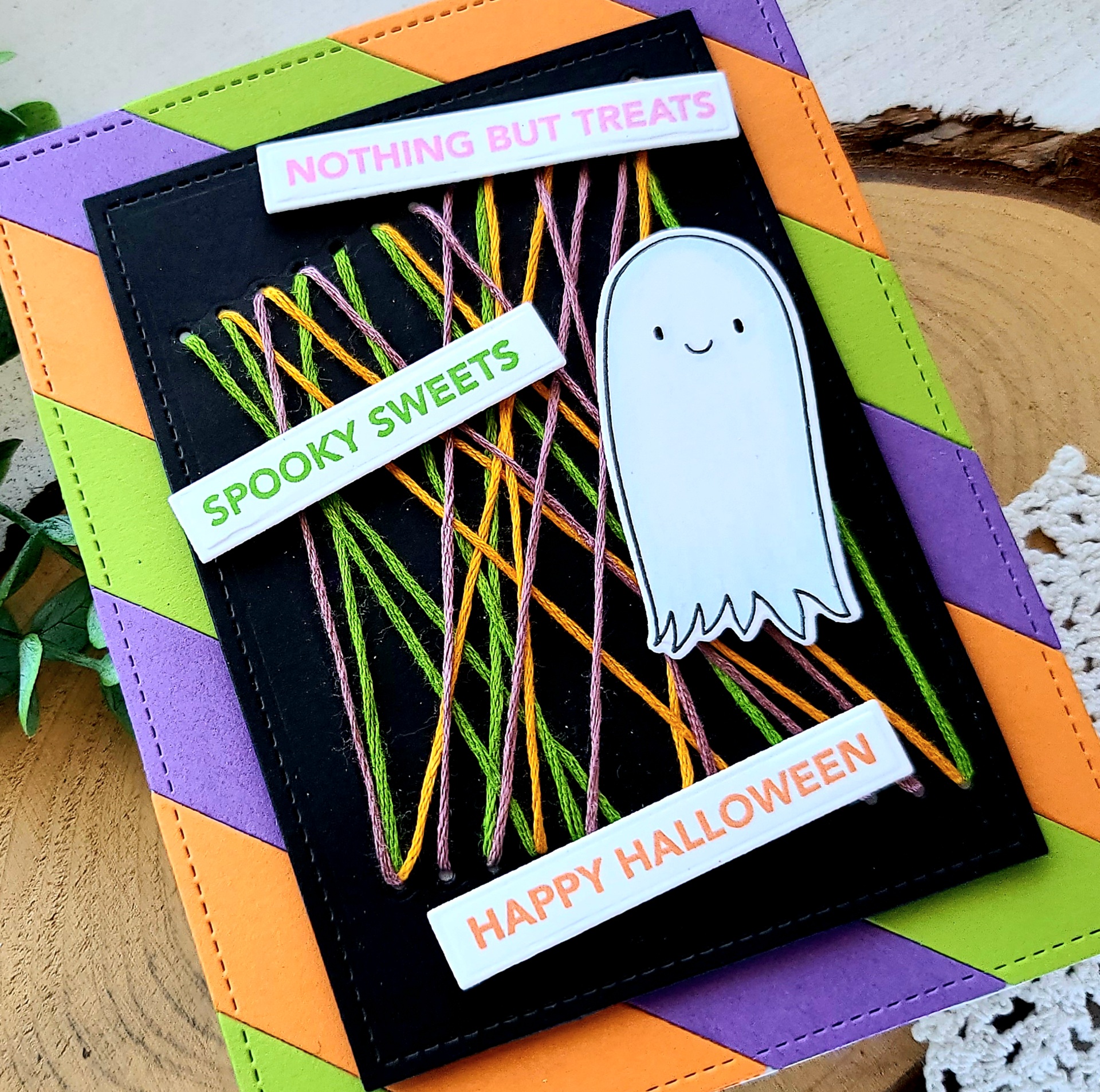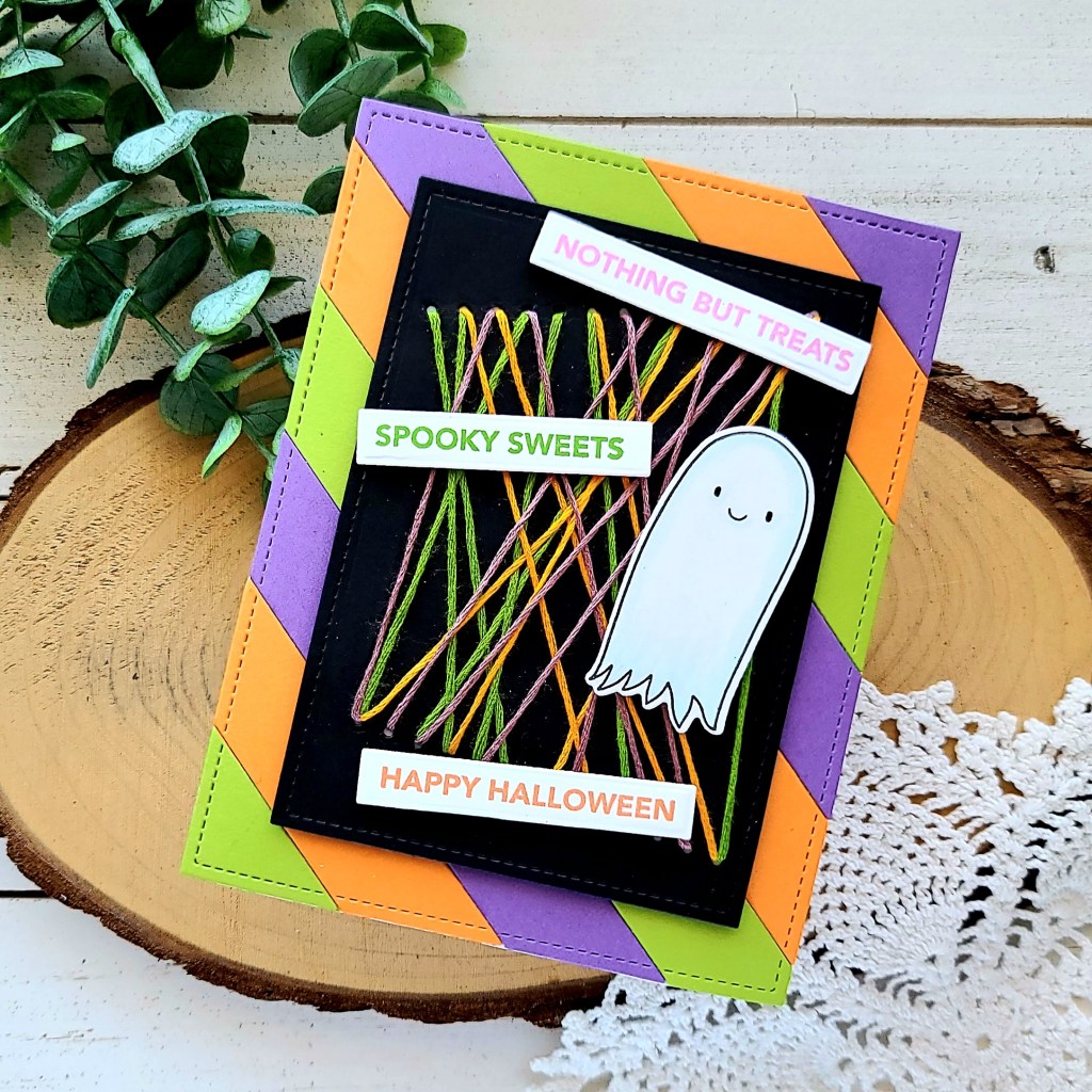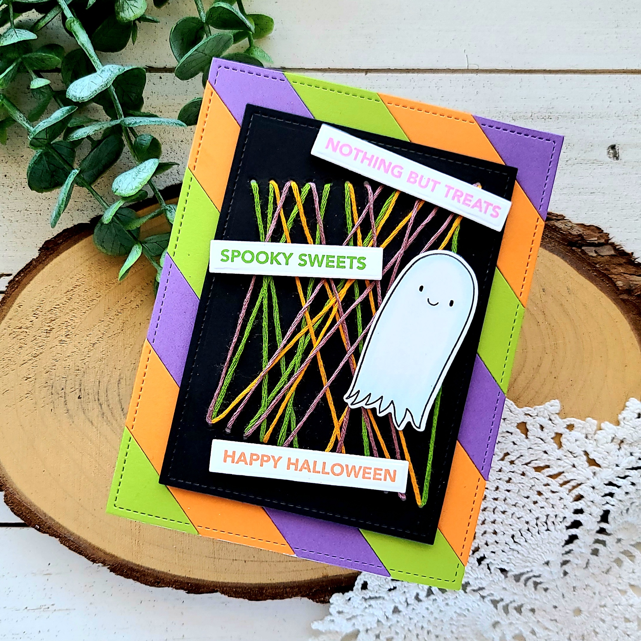 I chose sentiments from Tag It Halloween and stamped them in coordinating colors. Then I used a Pink & Main sentiment strip die to cut them all out. I stamped another ghost and used the coordinating die to cut him out and popped everything up with foam strips and squares.