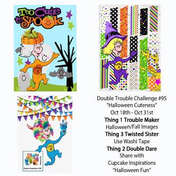 There is also a fun Halloween Challenge going on over at Double Trouble Challenge Blog!  If you create something with a coffee, tea or cocoa product from a CLC sponsor AND yours is Halloween themed, you can link it up over there too for more chances at prizes!  (If you use washi tape, you’ll meet the twist and that will get you extra chances to win at Double Trouble).  AND they are partnering with Cupcake Inspirations Halloween Challenge as well!  Be sure to check their rules if you’re playing along with them.  I’m playing along with both…