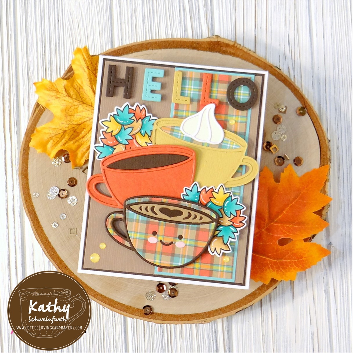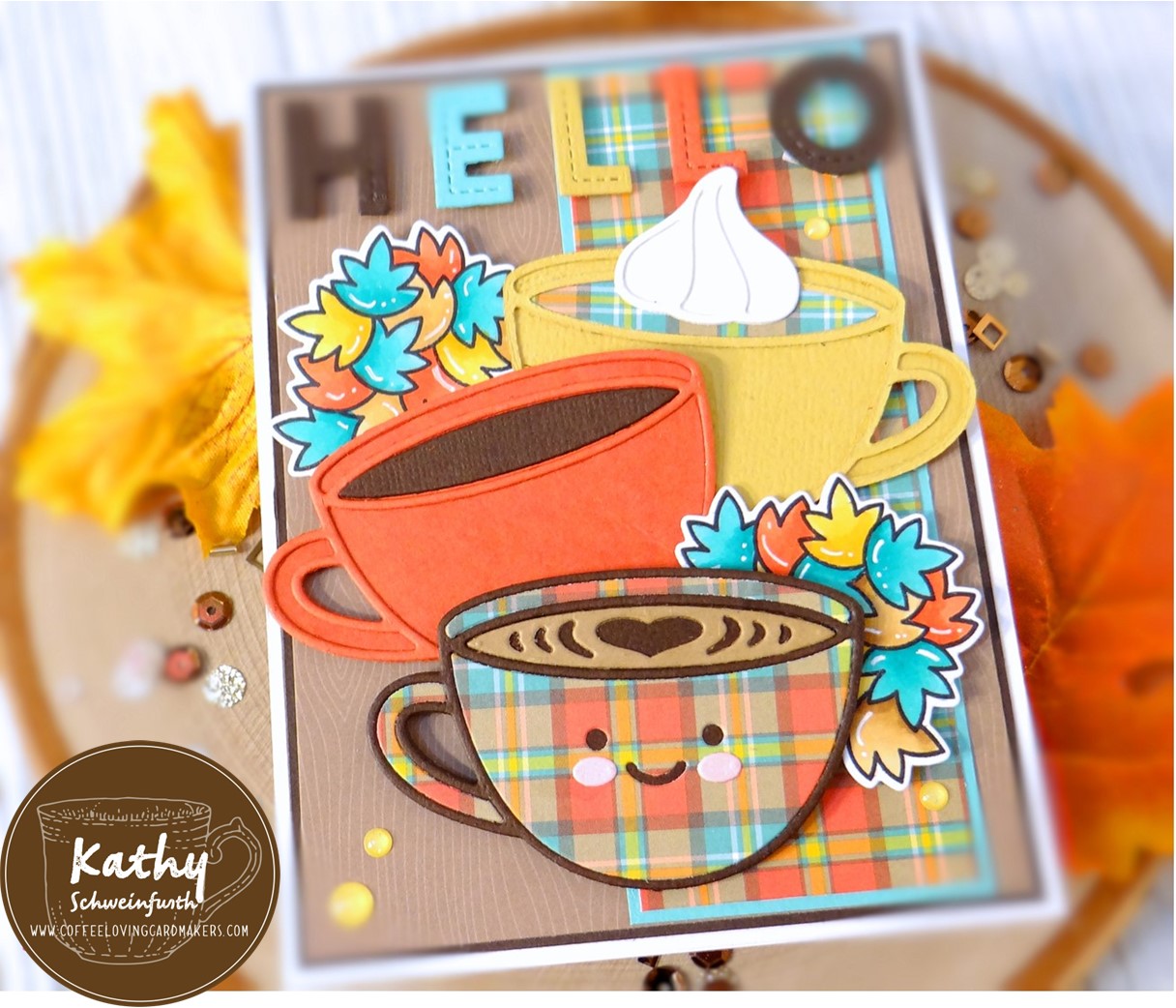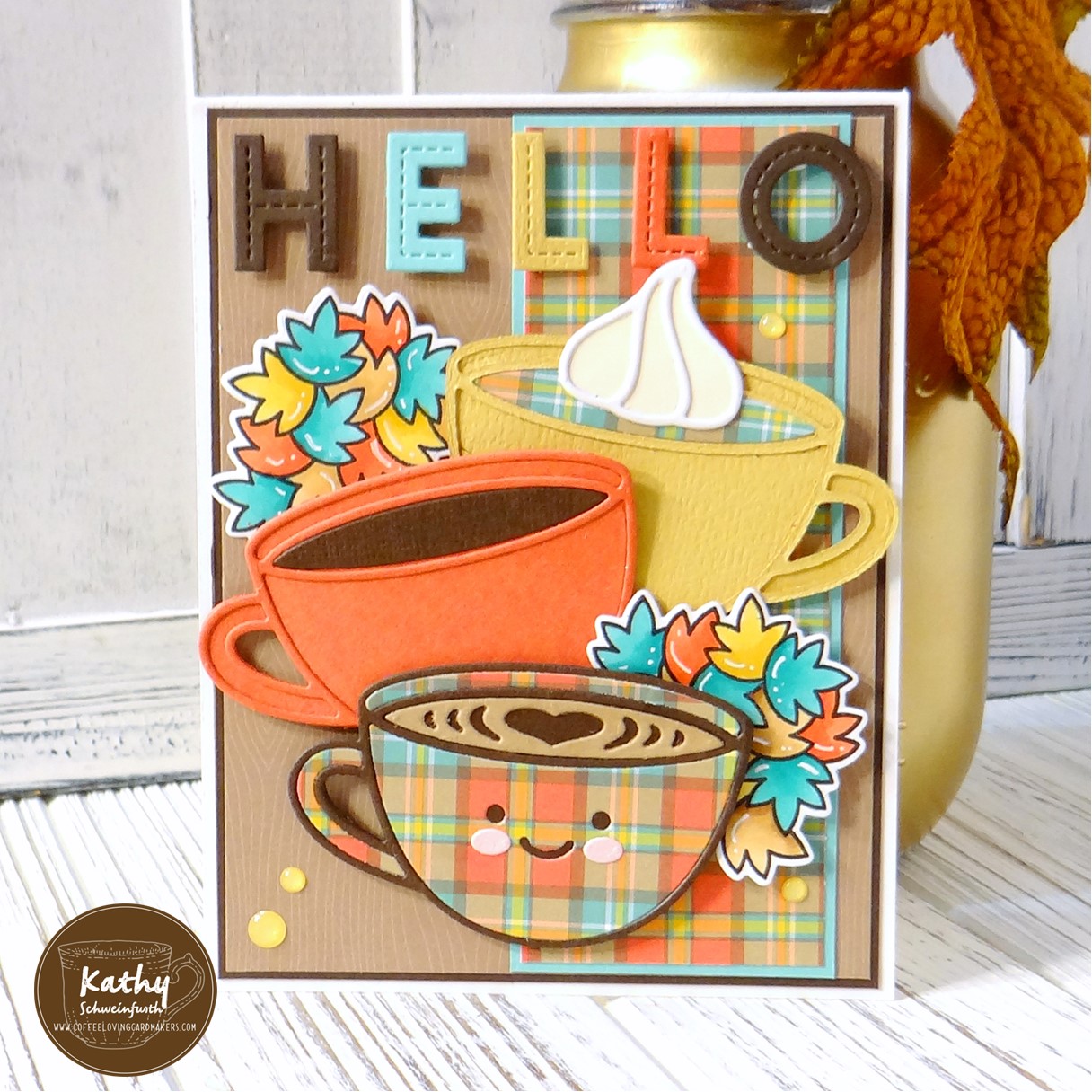 For my card, I used several goodies from Lawn Fawn! I layered dark brown cardstock and wood grain pattern paper onto the card base. I LOVE the new Lovely Latte die! I paper pieced the one in the front with a design from the Perfectly Plaid Fall Petite paper pad I found in my stash and cardstock on the other two. I added the leaves image from the Jump For Joy set which I copic colored. The ‘hello’ was cut from coordinating cardstock with the Oliver’s Stitched ABC dies.