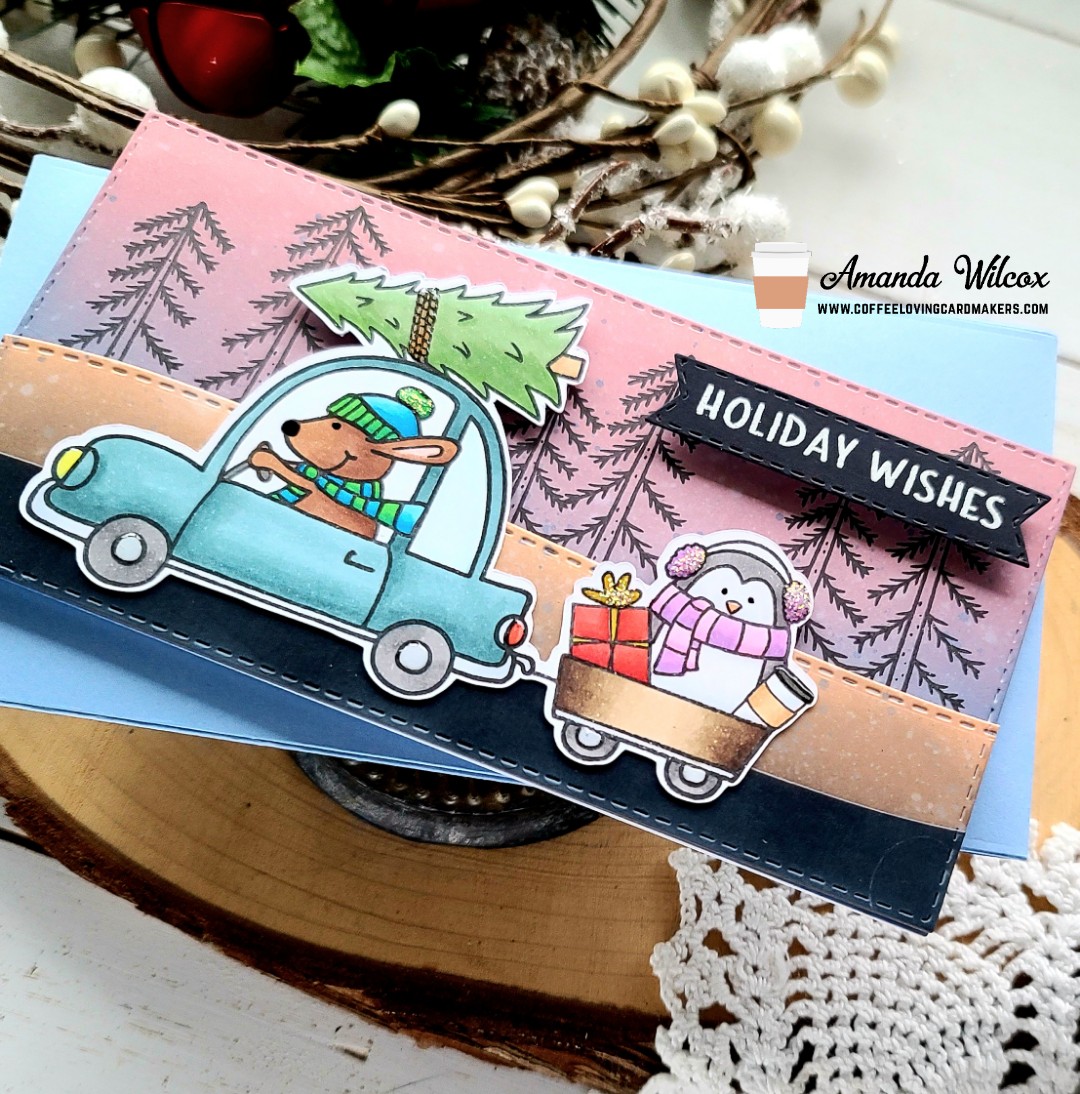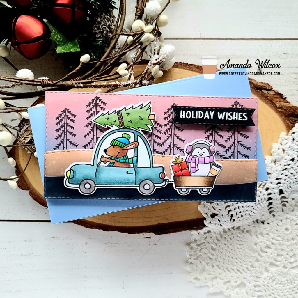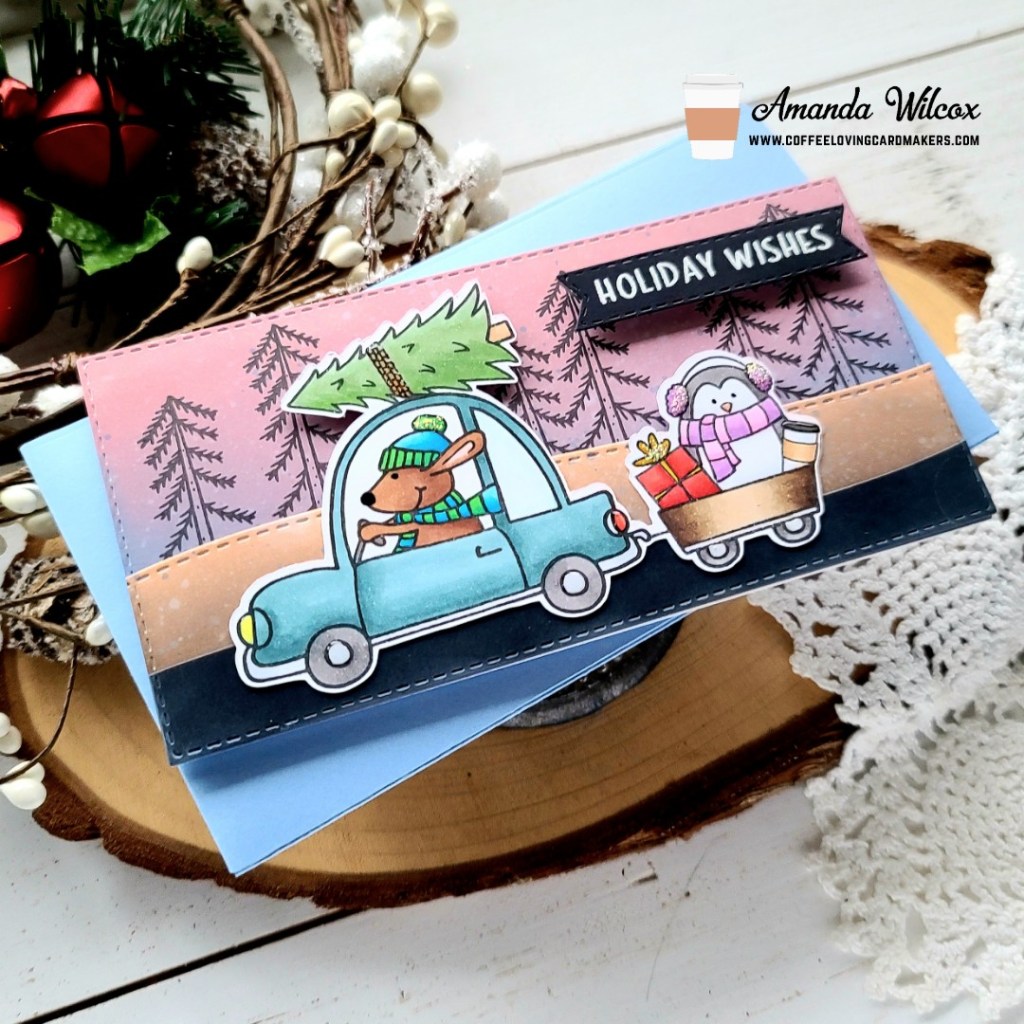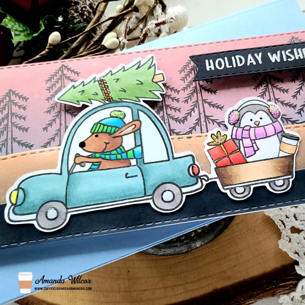 I finished things off with black glaze pen on the critter eyes and the dog’s nose. Then glossy accents on the penguin beak, coffee cup lid, lights and wheel hubs on the card and trailer and also the rope around the tree. For a little shimmer fun I added unicorn Stickles to the penguin’s earmuffs, the bow on the gift and the dog’s pompom.
