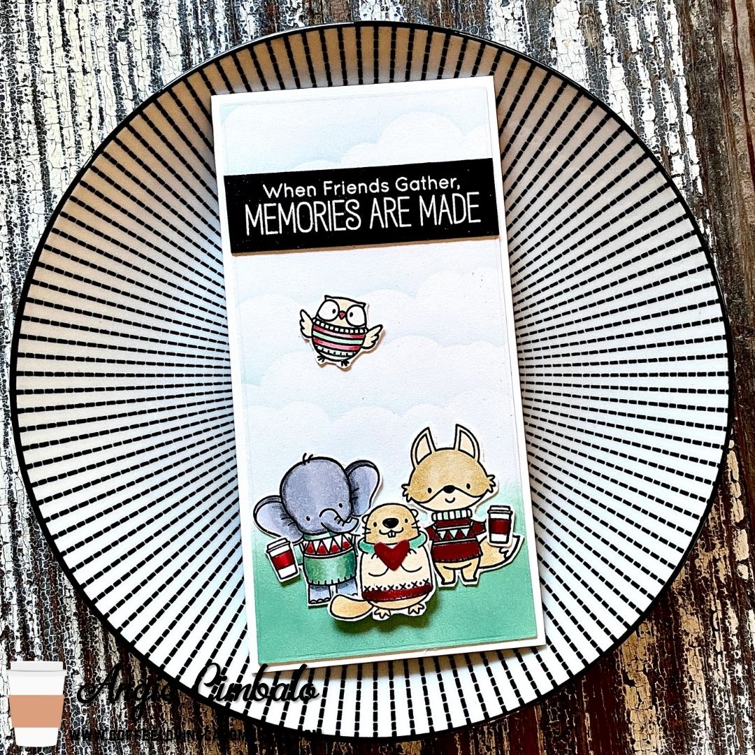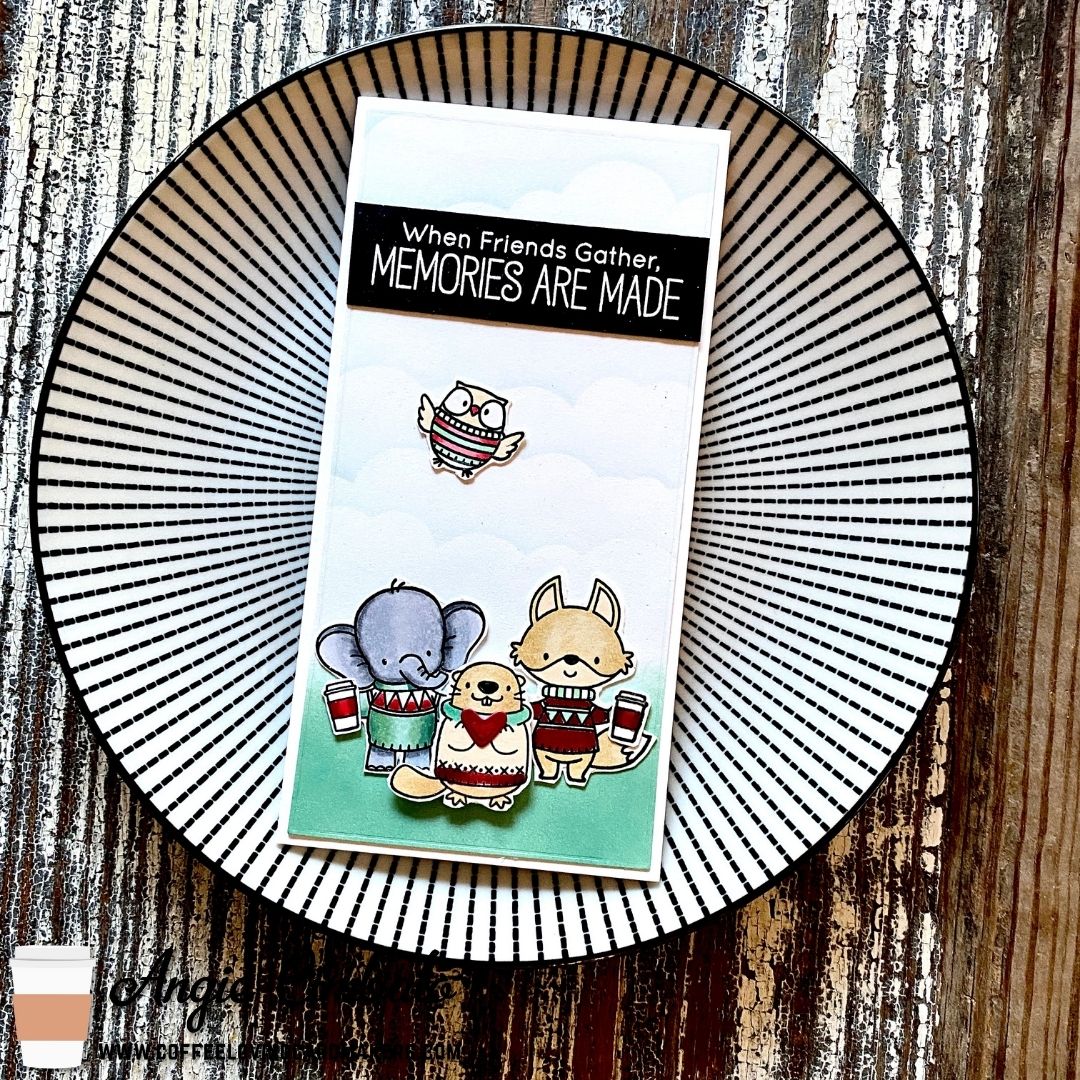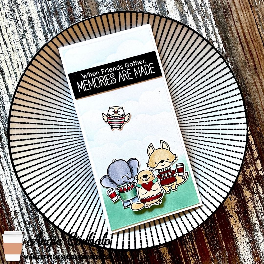 Today my card features one of my favorite coffee stamps from MFT Stamps called Sweater Weather in the Woods. in a mini slimline friends cards Here’s a closer look: