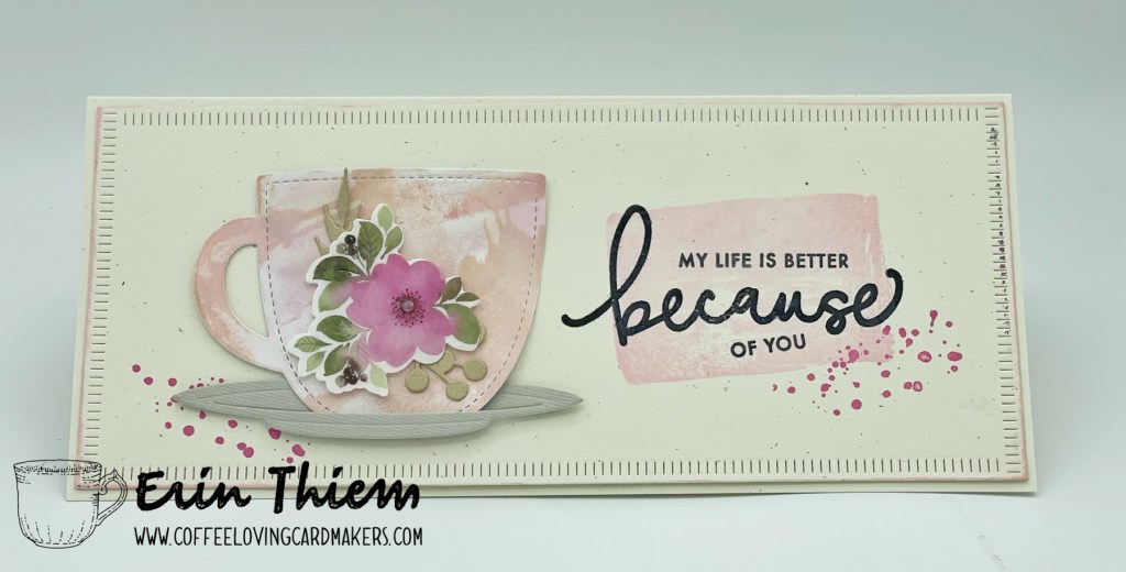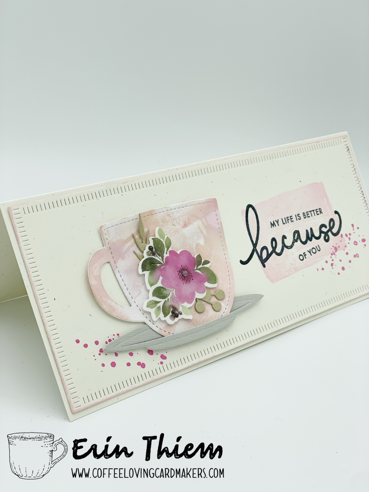 Hello, Erin here for another Creative Chaos. If you could see my desk you’d know that’s a literal statement…. I still have scraps and pieces from the blog hop in corners of my desk… but today I decided to make a slimline card mixing and matching goodies. I’ve used a Lawn Fawn coffee die, colored with a brayer (someone showed a video on social media recently of coloring tips with the brayer and because I’ve got one I decided to dust it off!). The sentiment and background stamps are from Concord and 9th, slimline die and flower washi die cut from Pink Fresh Studio and saucer die from Lil Inkers Designs. I hope everyone is doing their best with the crafty sales online… it’s hard, I hear ya!