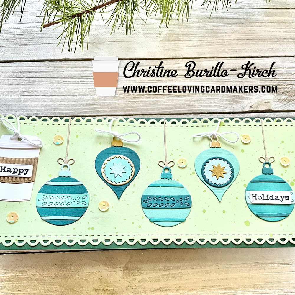 Hello there, Christine here with a paper pieced card featuring a coffee cup and ornaments from Super Sponsors Trinity Stamps and The Greetery.  I love to do paper piecing, I find it more relaxing than stamping or coloring because less can go wrong!