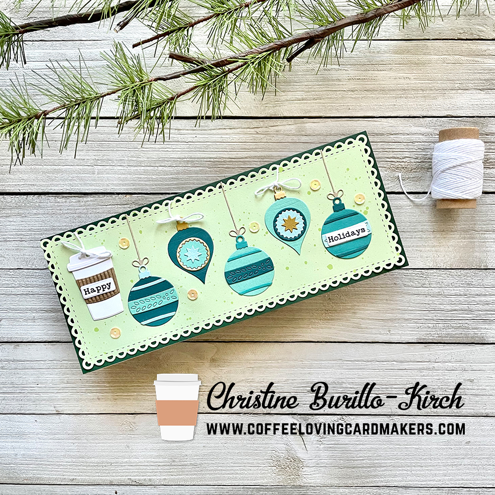I die cut the background panel using the Trinity Stamps Slimline Dainty Scallop die set and the ornament hanger from the Trinity Stamps Slimline Hanging Ornaments Panel die set.  I made the sentiment using the new Trinity Stamps Simply Sentimental- Happy stamp and die set.  I love the type font that is used in a lot of the sentiments on this stamp set.  The coffee cup ornament is available and part of the 2020 Trinity Mini Tag Collection die set.