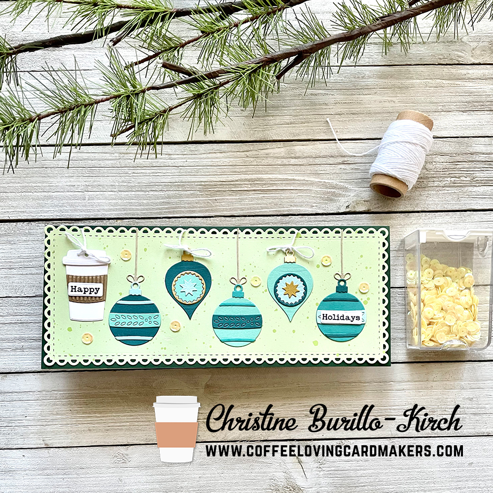 Hello there, Christine here with a paper pieced card featuring a coffee cup and ornaments from Super Sponsors Trinity Stamps and The Greetery.  I love to do paper piecing, I find it more relaxing than stamping or coloring because less can go wrong!