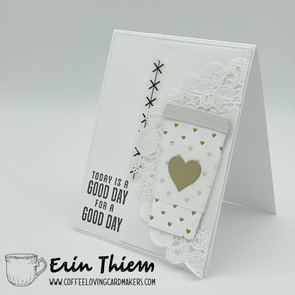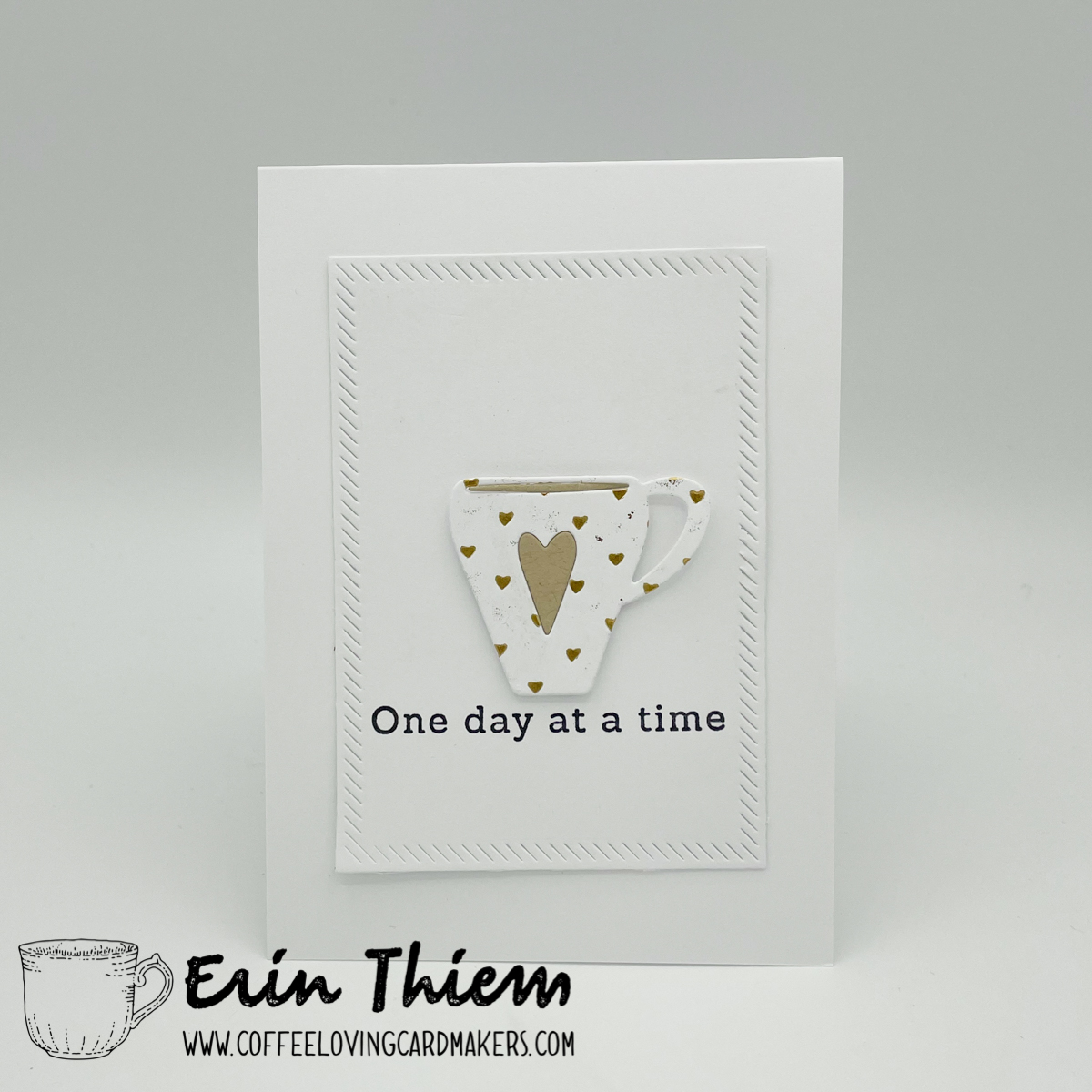 Hello, Erin here for another Creative Chaos post… channeling my love of white on white for 2 coffee cards using similar elements (and yes, my craft desk is a total disaster). Both cards use The Stamp Market heart foil plate as the base for the cups (channeling a local pottery artist in my community, I have a very similar looking cup). My first card uses the MFT coffee die and a sentiment by Pink Fresh Studio. I used a heart die from Divinity Designs, a doily, some long neglected stickers and a couple of MFT dies for the rest of the card. My second card uses a Simon Says Stamps die for the coffee cup, Pink Fresh Studio sentiment and a MFT die.