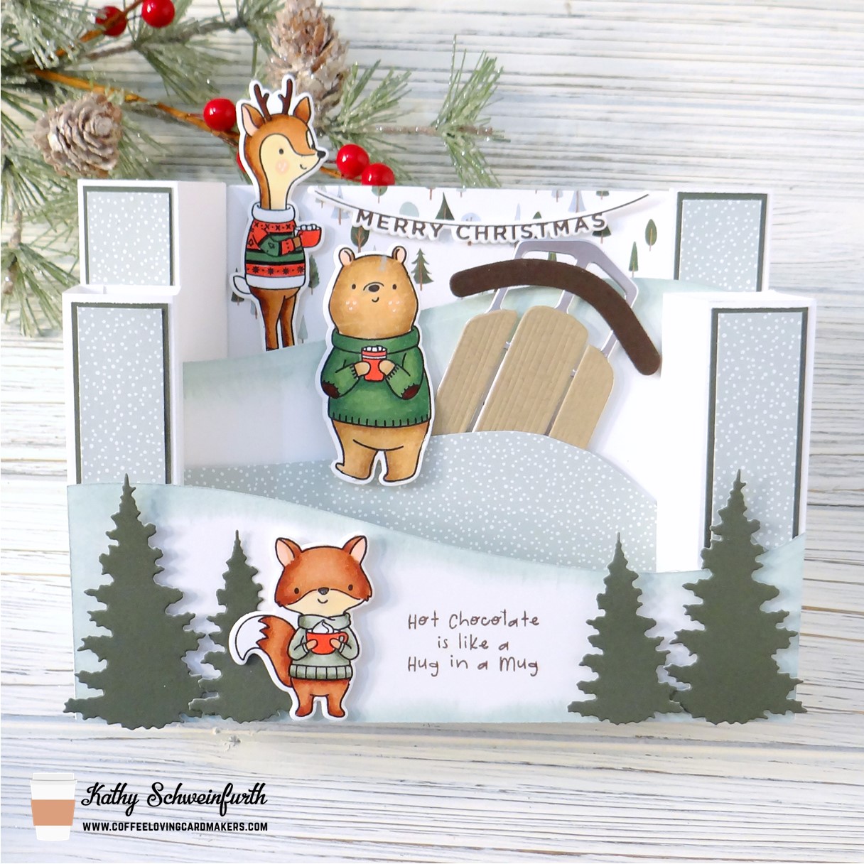 For my pop out card*, I created a winter scene with these adorable critters from Hello Bluebird’s Cocoa Party set who are enjoying their special cocoa. The evergreen trees and sled are dies from Divinity Designs.