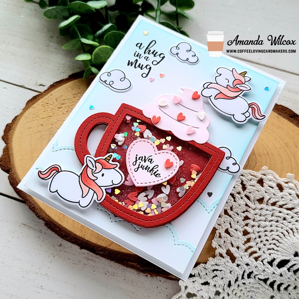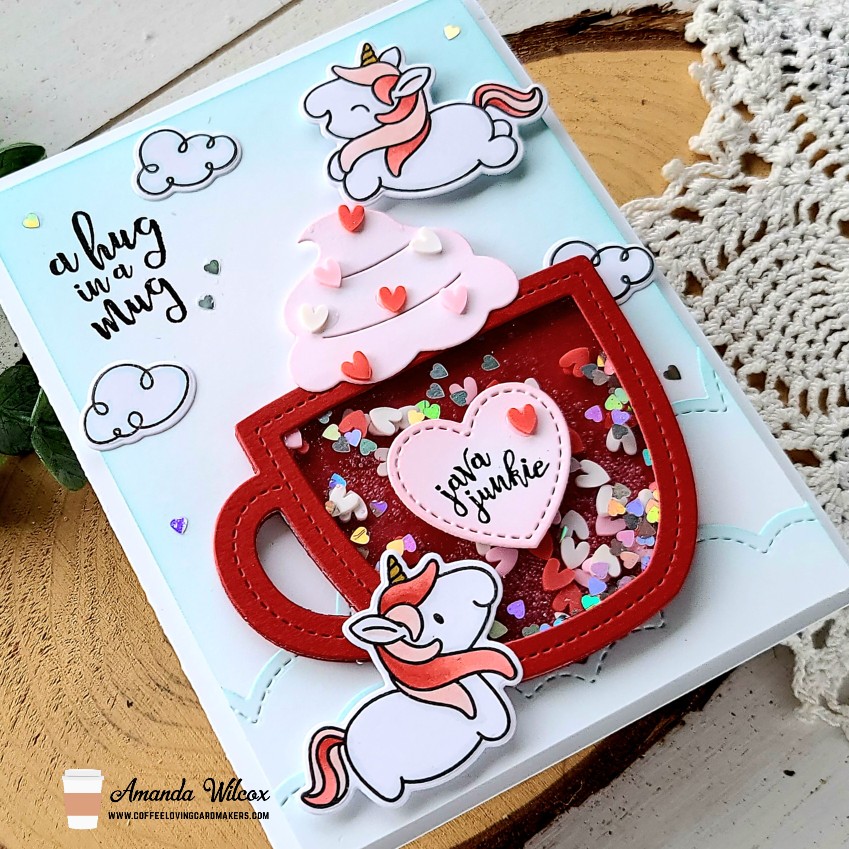 I recently picked up these adorable unicorns from Heffy Doodle that I’ve been eyeing for an eternity and I’m so happy to color them up in Valentine colors! Aren’t they adorable!?! Then I used the Lawn Fawn stitched mug die sets to create a shaker and filled it with three embellishments from Twiddler’s Nook – sweethearts clay hearts, holographic hearts confetti and rosetta pixie dust micro beads. The whipped cream on my mug is from the Lawn Fawn cupcake die set.