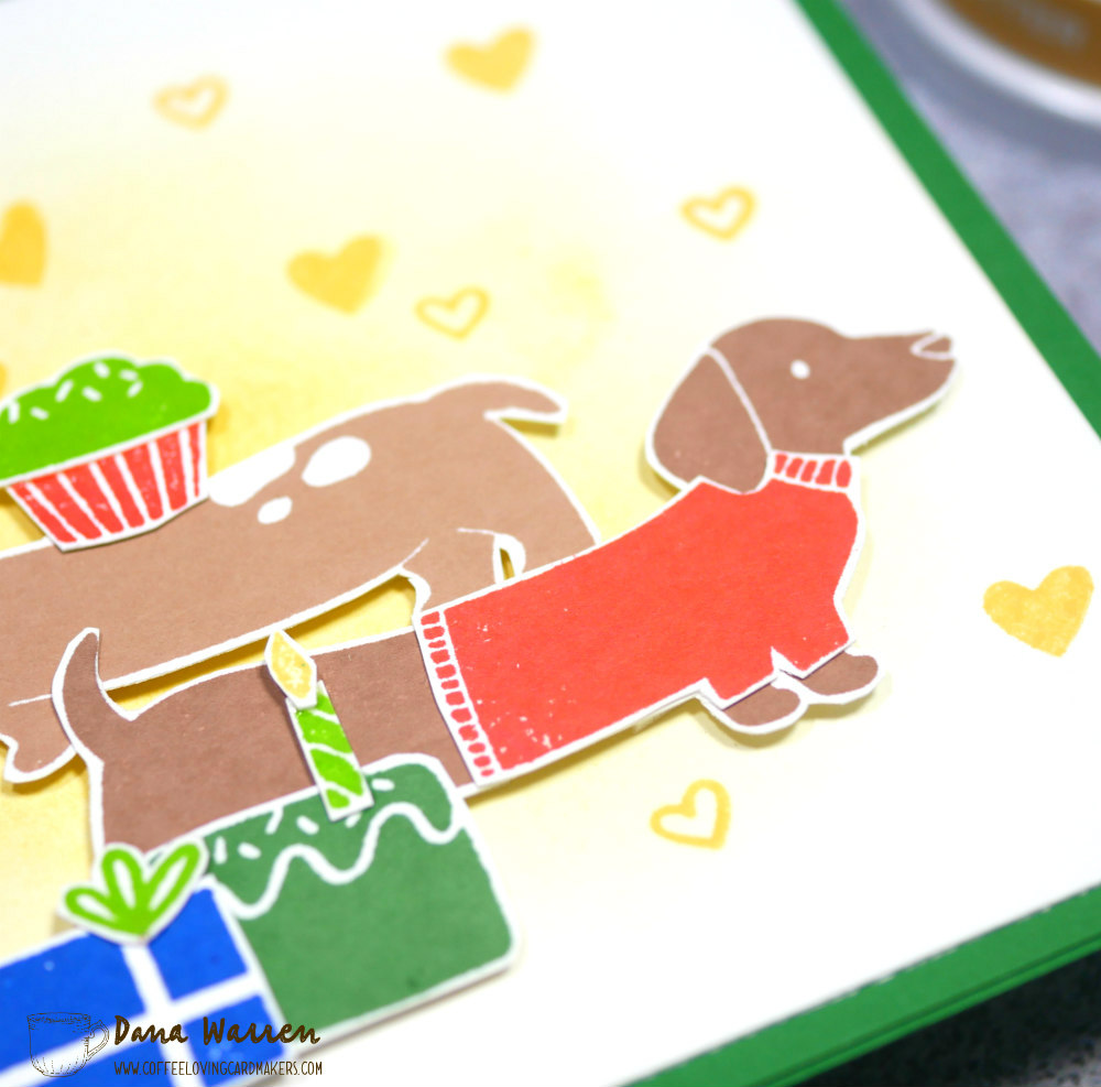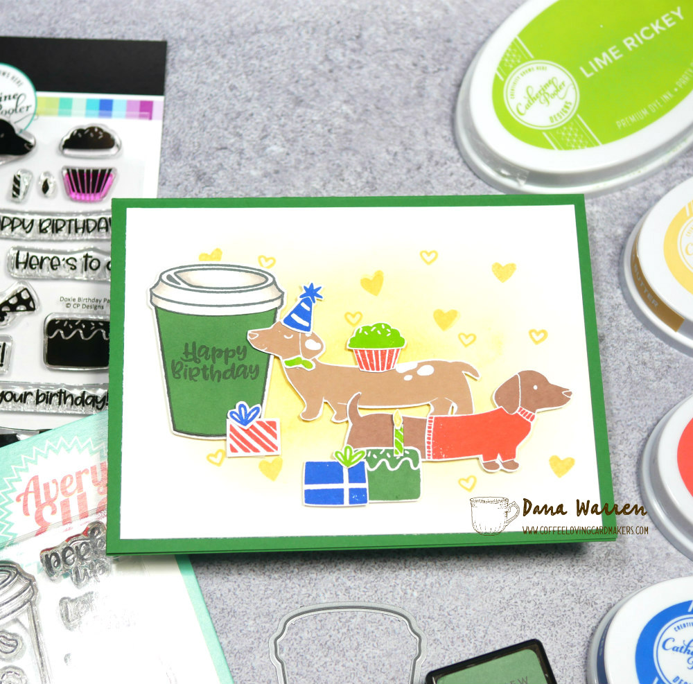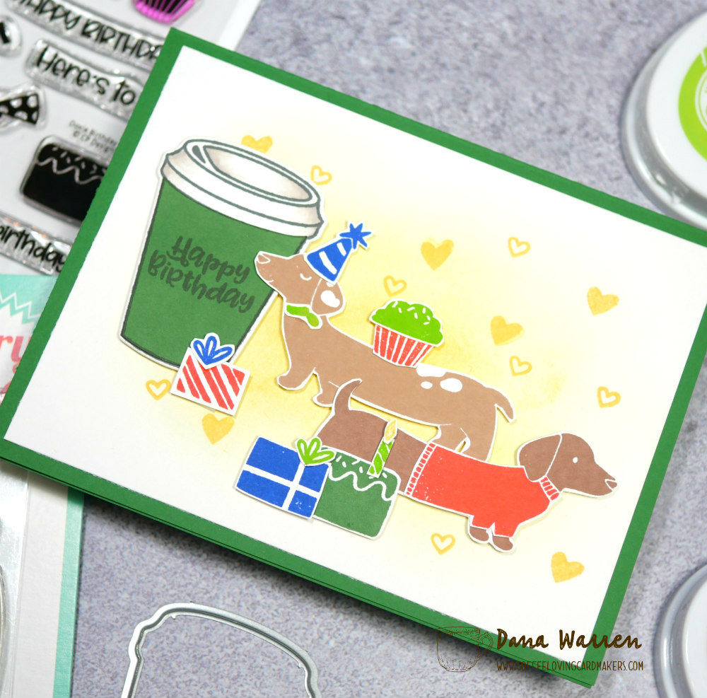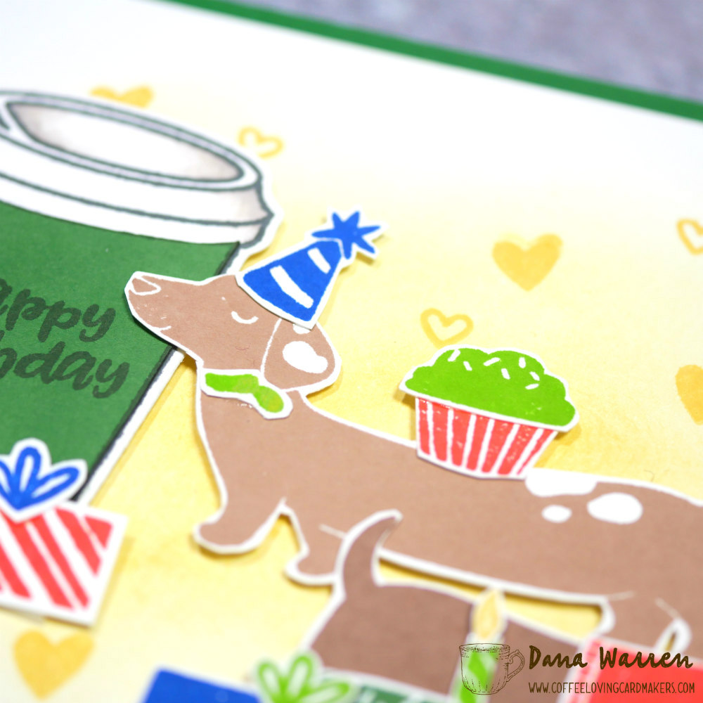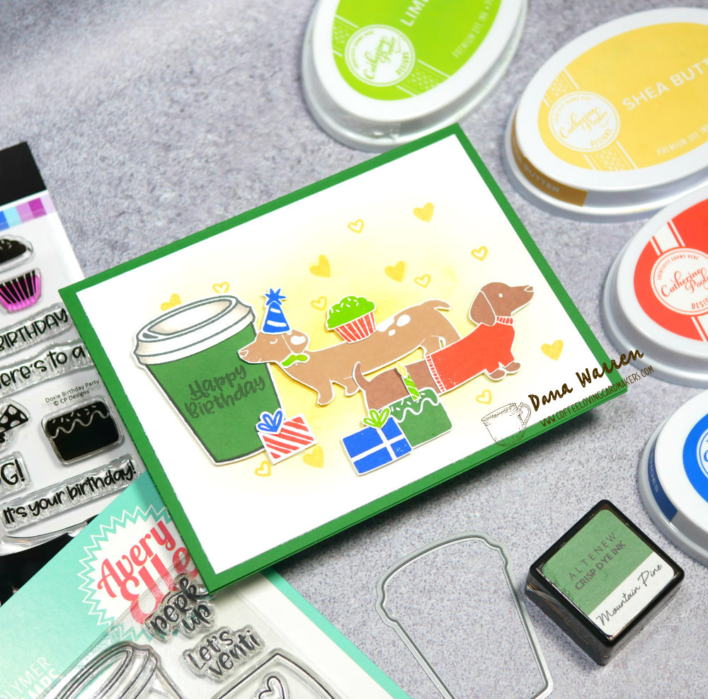 I went with a fun coffee card with cute dogs!! To create it I paired Avery Elle Cool Beans (I picked it up from Butterfly Reflections!) with Catherine Poolers Doxie Birthday Party stamp sets.