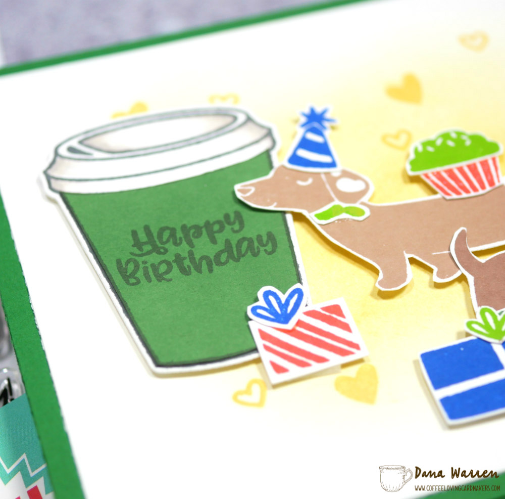 Before I adhered everything down with foam tape, I stamped Happy Birthday on the green coffee cup! Last, I added the panel to a dark green card base.