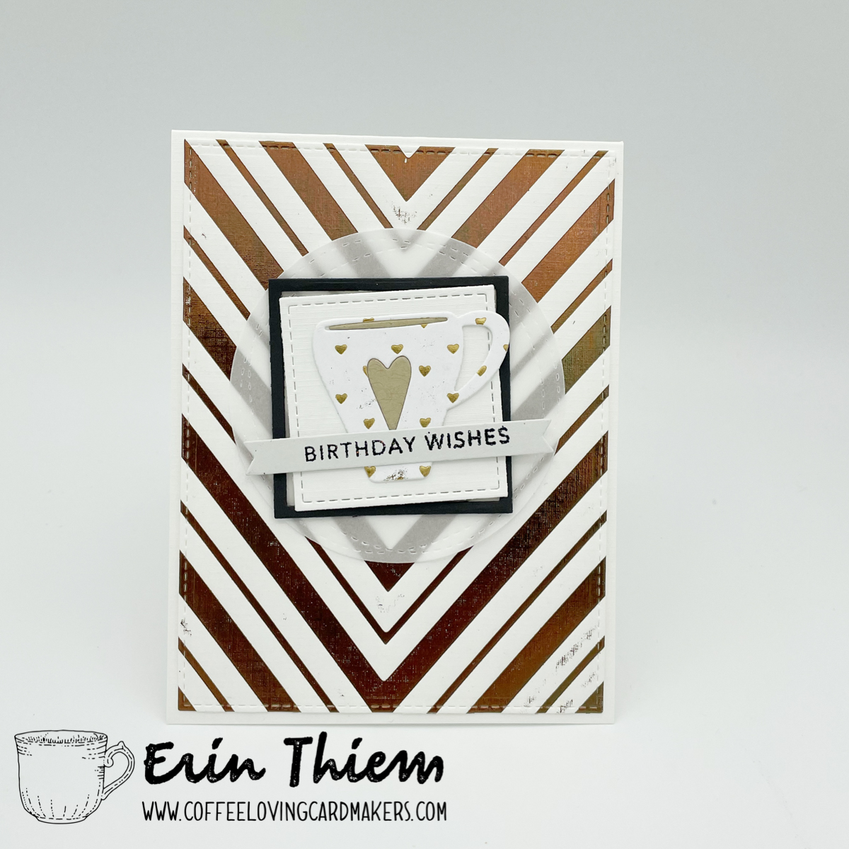 Hello, Erin here for another Creative Chaos post.. playing with a couple different foil colors and textures. The background chevron is from Pink Fresh Studios and the coffee cup foil is from The Stamp Market. I die cut the coffee cup with a Simon Says die, added the Taylored Expressions sentiment and die and layer the MFT vellum circle with a Reverse Confetti square dies. Hope your Saturday has a little sparkle to it.