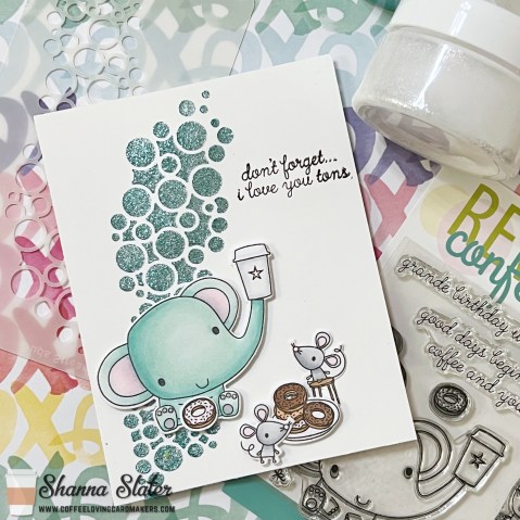 I have had this Reverse Confetti stamp set for ever and finally cracked it open to play with!! I adore that cute elephant, not to mention the mice!! To make the card I used a stencil in my stash from A Colorful Life Designs, some Glitz gel from super sponsor Gina K, some Paper Glitz from Picket Fence Studios, and of course the stamp and coordinating dies from super sponsor Reverse Confetti. (I unfortunately think the set is retired now)