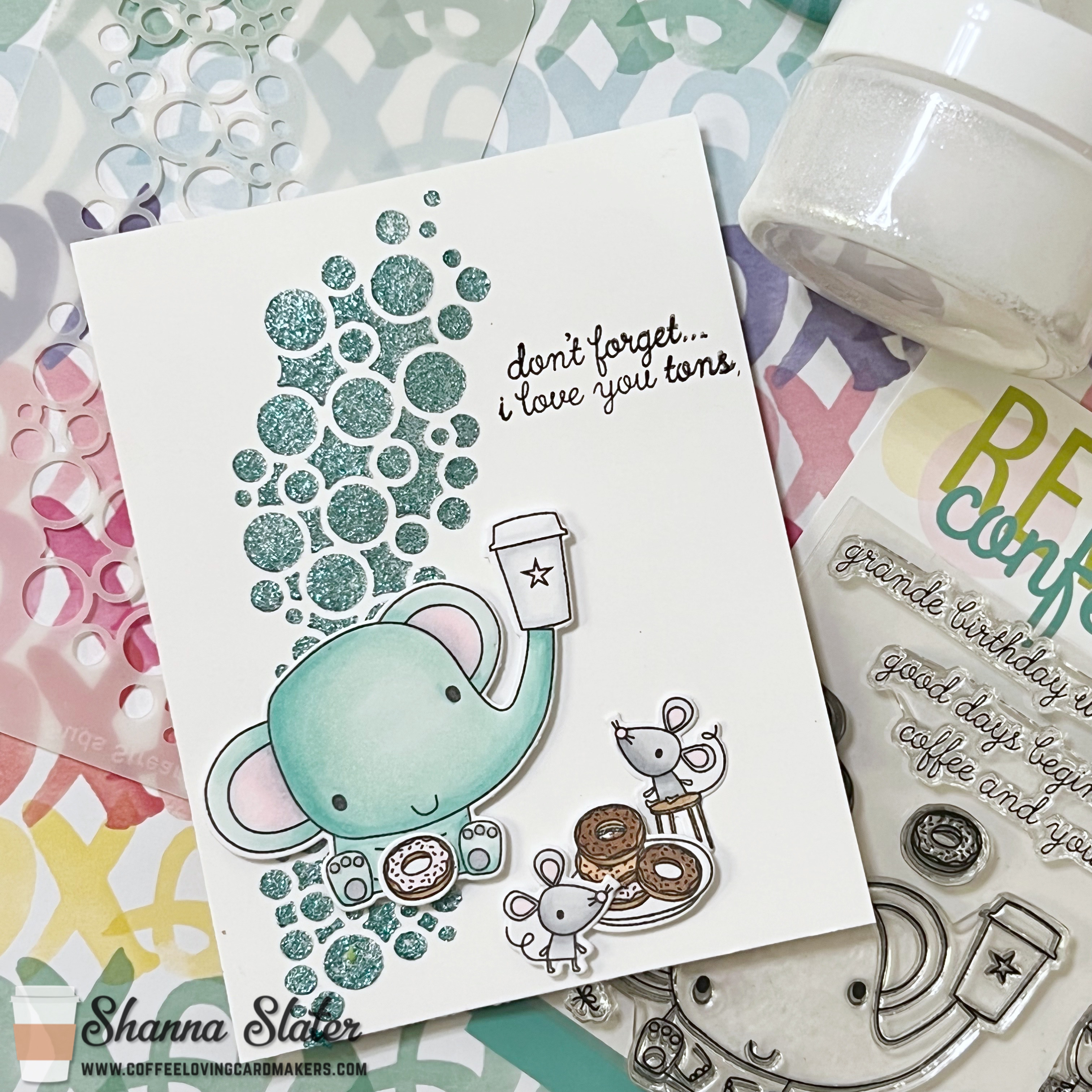 I mixed the 2 different Glitz gels to gain a lighter turquoise to coordinate with. my Copic colored elephant. After the gel was dried, I adhered the different die cut images using a combination of foam tape and glue. Mounted the finished panel onto a card base and was done!