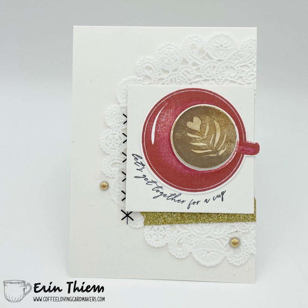 Hello, Erin here for another edition of Creative Chaos. I love a CAS card with a pop of color and a little bit of sparkle. I’m using The Greetery mug and sentiment with a Reverse Confetti square die, SRM sticker, Pinkfresh Studio embellishments and a bit of gold washi tape (oh and a doily I stole from work). Hope your weekend is fabulous and there is a little creative time in your agenda.