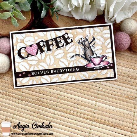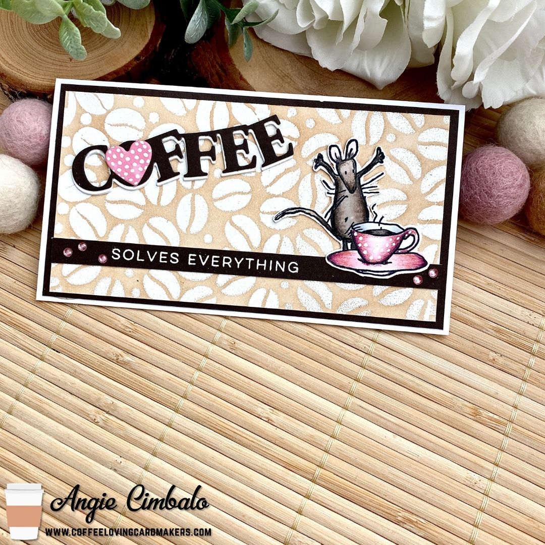The background was made with a new to me “Coffee Beans” stencil (gifted to me by a dear friend for Christmas!) from Stamp Anniething. I used Versamark ink with the stencil, then added white embossing powder. One it was embossed, I trimmed it down a little and added “Tea Dye” Distress Ink with a domed blending foam. I matted the bean panel on a brown panel, slightly larger, then added it to the card base.