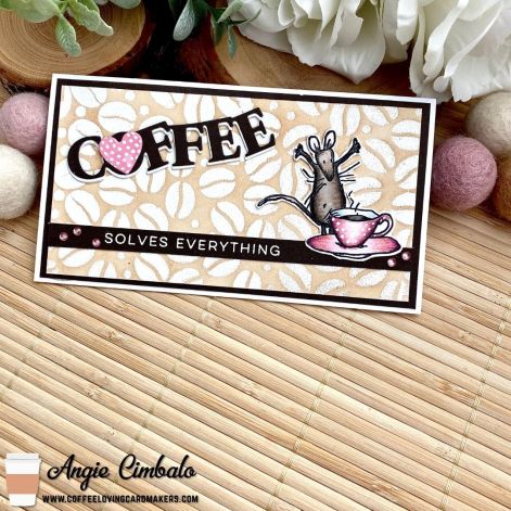The coffee word die is from Super Sponsor “Stamplorations” cut 2 times in white and once in brown, then stacked for dimension. The “solves everything” is from a retired stamp set from Super Sponsor “Right At Home” called “Cup of Joy.” I only used those two words from one of the longer stamps by cutting those two words off the sentiment stamp. It is heat embossed in white on the same brown card stock.