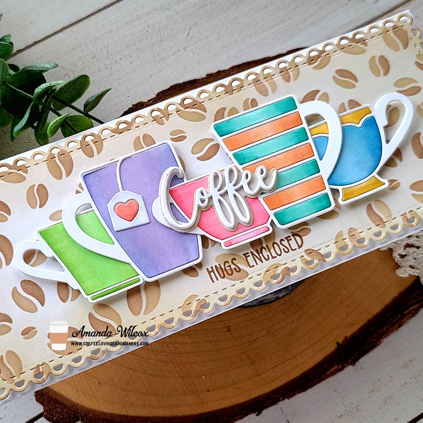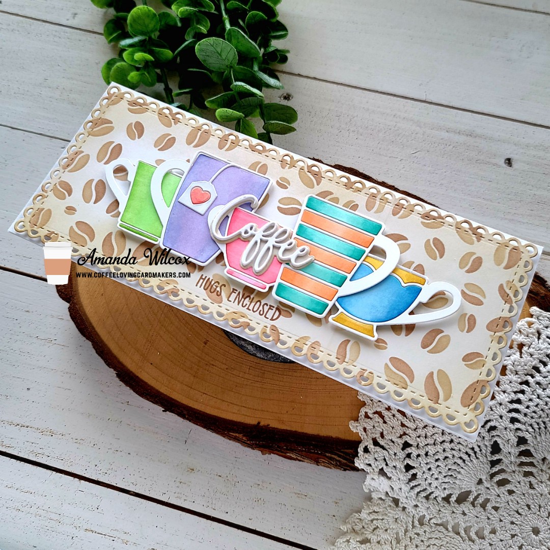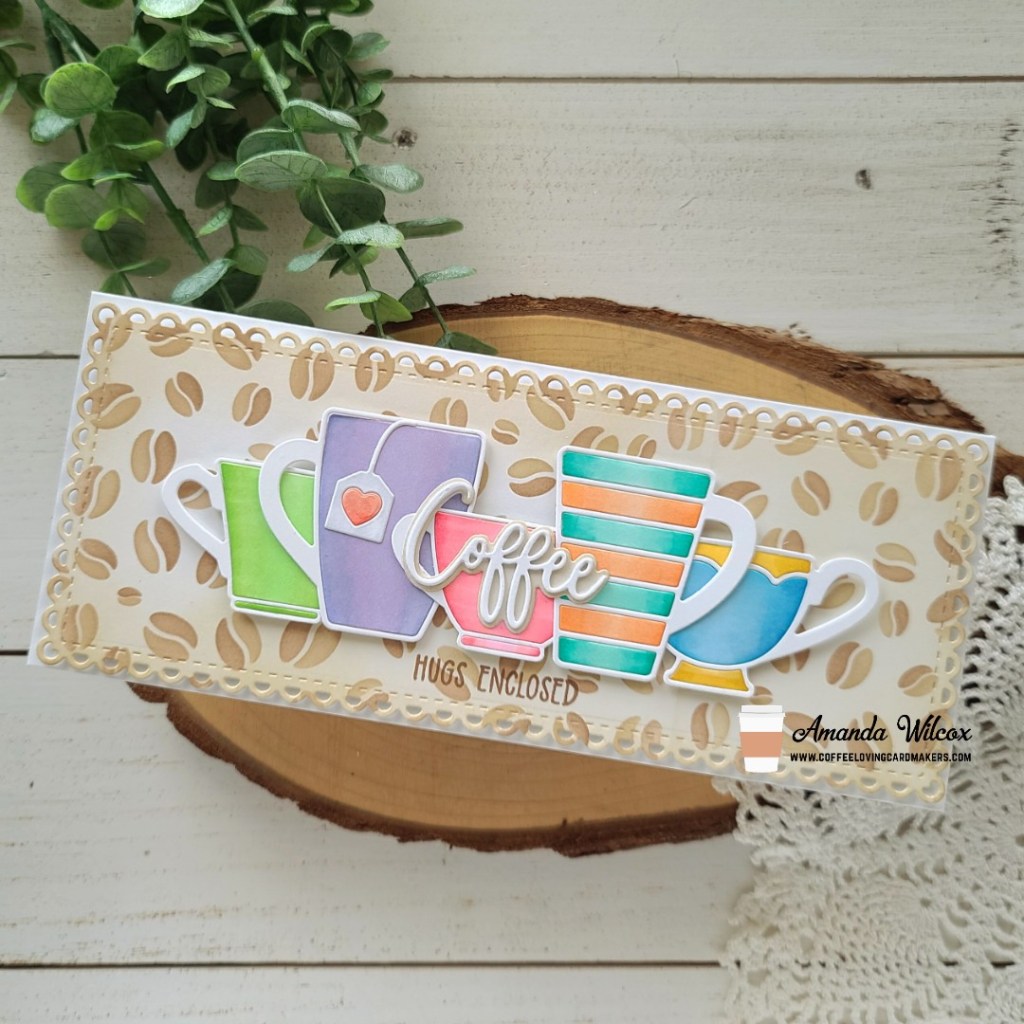 Happy Tuesday everyone! It’s time for tea so grab a cuppa and let’s craft! This is Amanda from Twiddler’s Nook and I have a slimline card to share featuring goodies from Trinity Stamps. Did you know that you can get a free mug die with a $25 order? There is a series of 12 different cups to collect. They are so fun but I hadn’t actually used them yet. So today I have a card featuring 5 different ones!