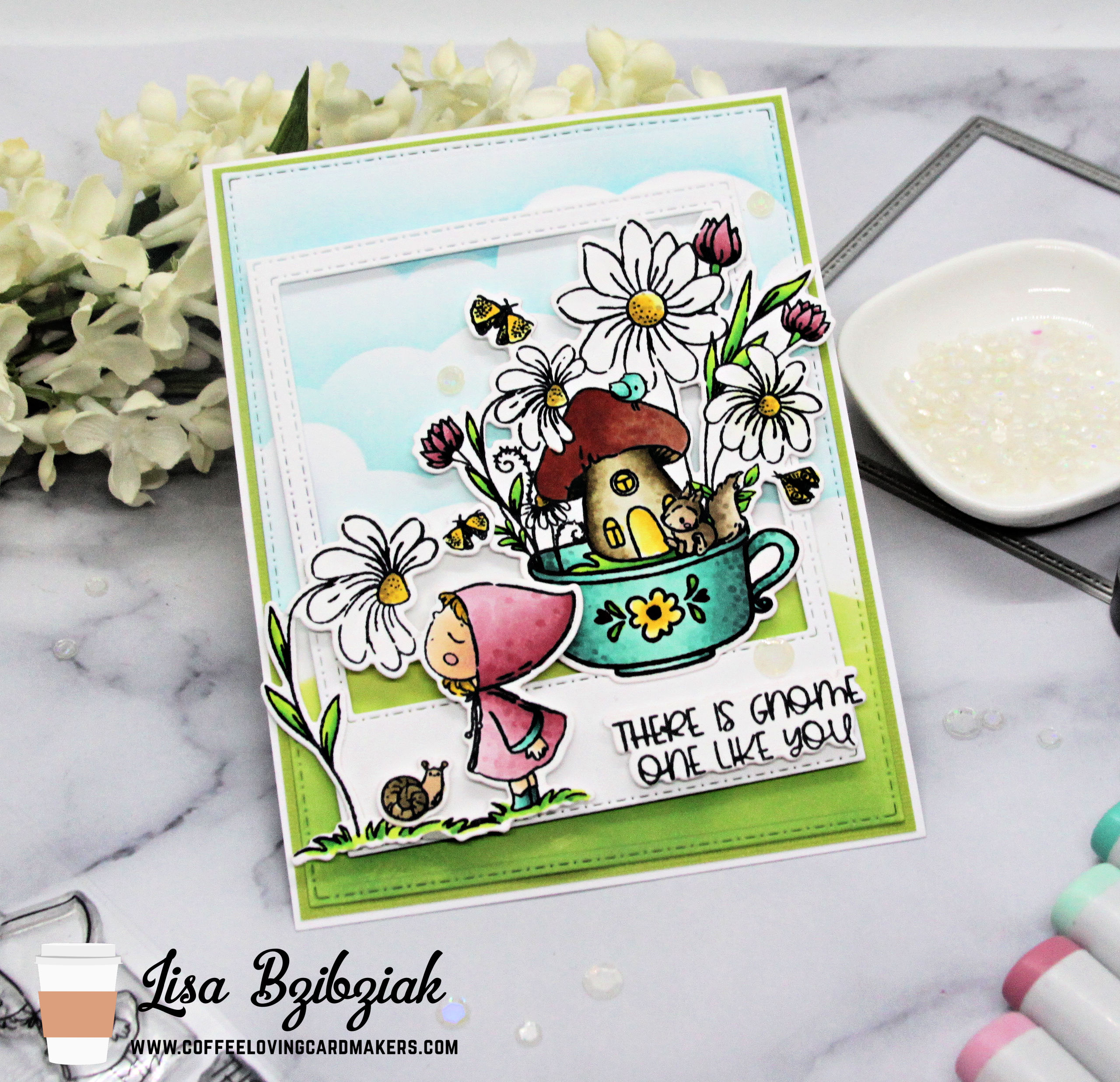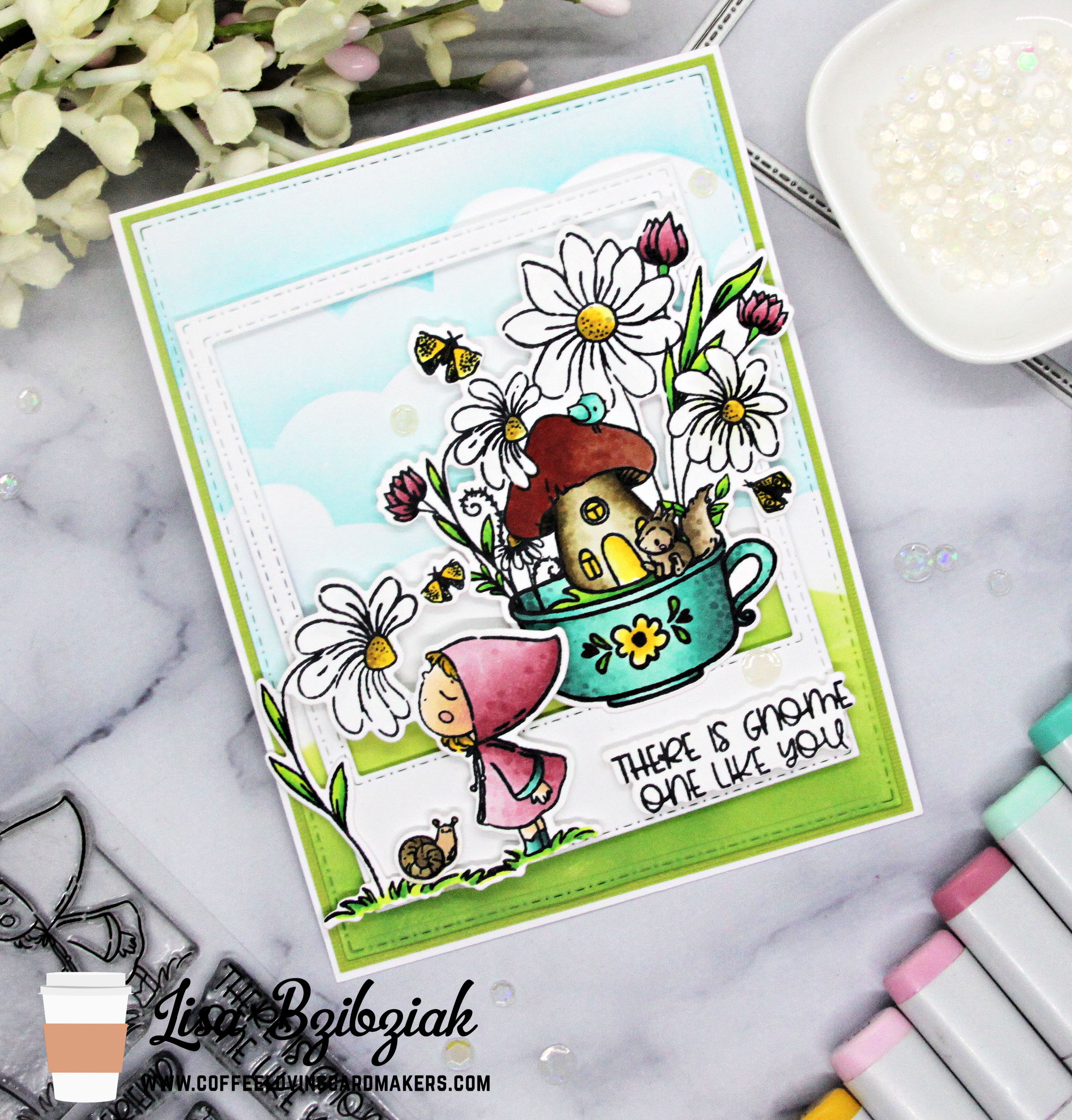 And that sweet little gnome sniffing the daisy!!  Love that the dies are so detailed!  I had created the cloudy sky for another project and then changed my mind so I just added some grassy hills and used it for this one!  Love it when I use up extras from other projects!